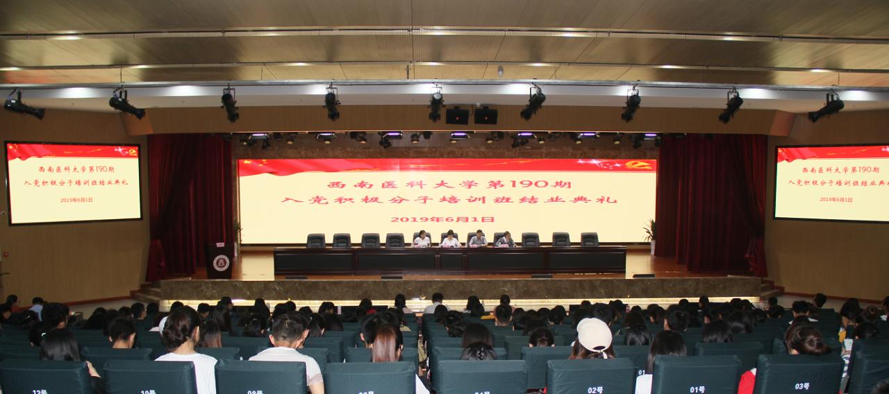 2019年6月1日,西南医科大学党校第190期入党积极分子培训班结业典礼在德诚楼学术报告厅举行。中西医结合学院•附属中医医院党委书记、分党校校长王琳,党办、宣传部、学生科负责人、体育学院、医学影像系、儿科系等指导老师及494名入党积极分子参加了结业典礼。结业典礼由中西医结合学院•附属中医医院党办主任、分党校班主任周明华主持。