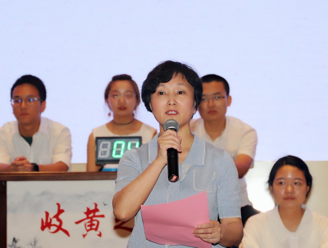 王琳致辞,她代表中西医结合学院·附属中医医院向莅临本次竞赛的各位领导表示欢迎,她要求同学们以赛搭台,展示各自风采;以赛促学,浓厚学习氛围;以赛促练,培养团队精神;进一步推动中医药经典文化教育。