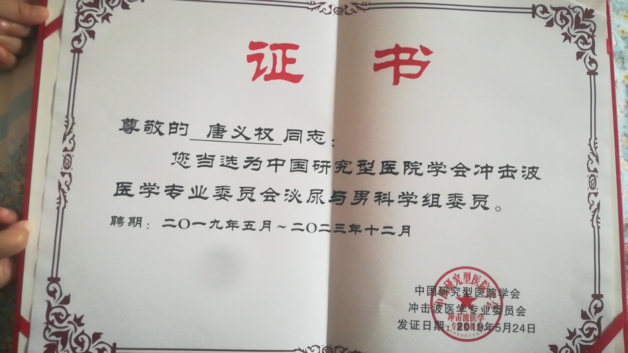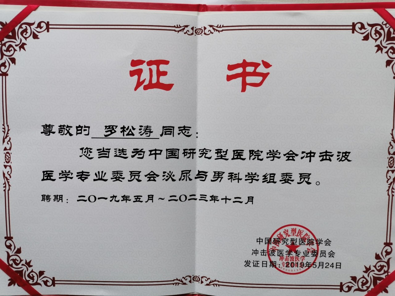 与此同时,罗松涛副教授、唐义权主治医师当选为第一届研究性医院冲击波泌尿外科与男科学组委员。