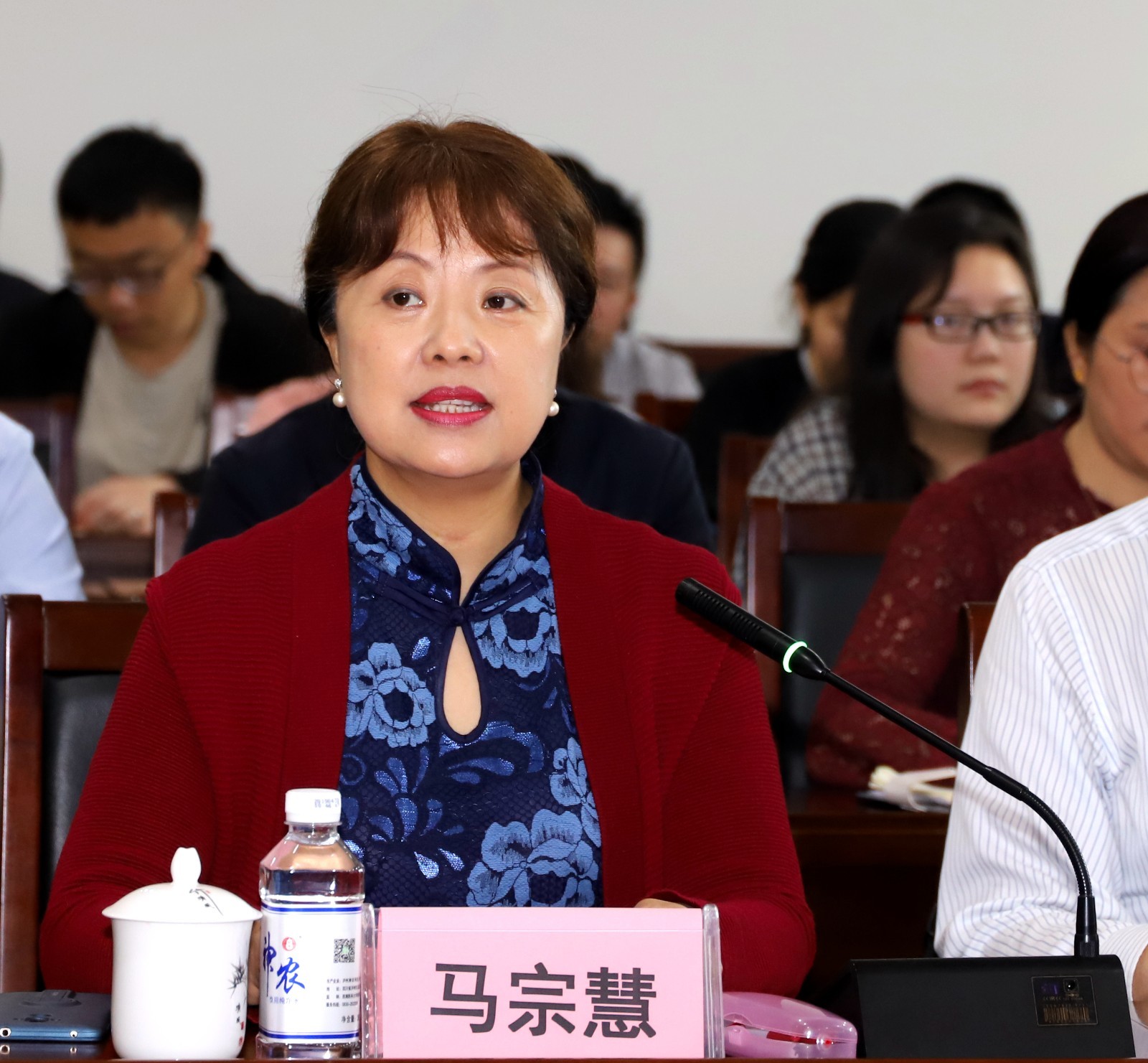 马宗慧致辞,她介绍了泸州市基本情况后,希望与会领导和专家一如既往地关心和支持泸州,助力泸州中医中药事业的发展。