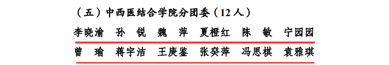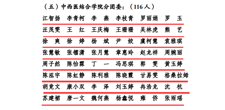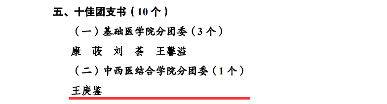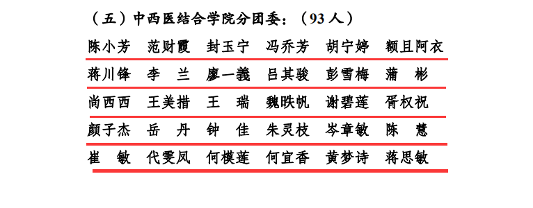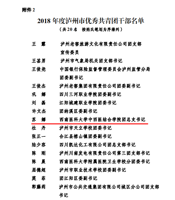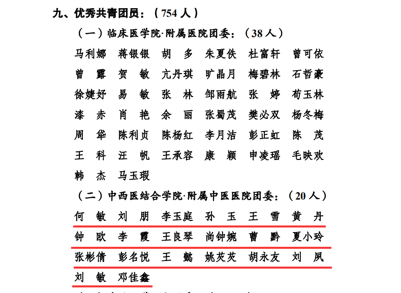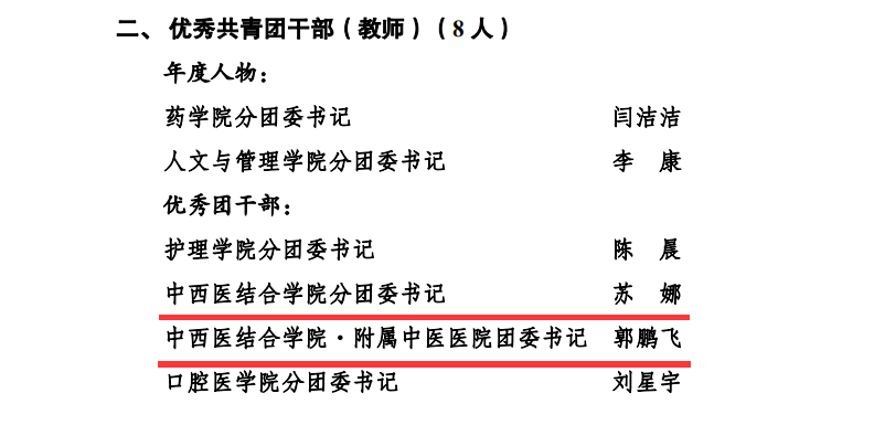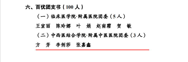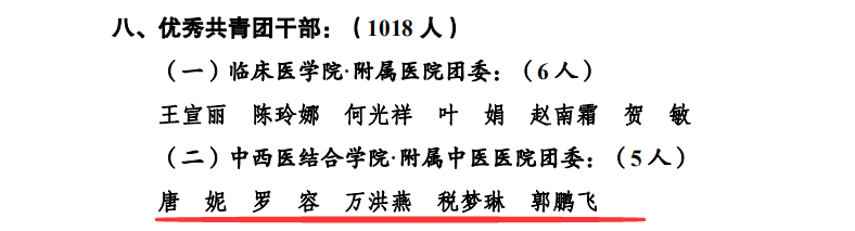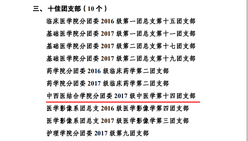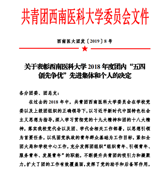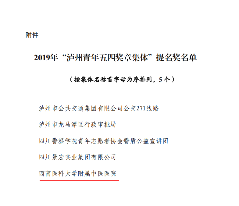2019年5月4日,在西南医科大学五四创先争优表彰中,中西医结合学院分团委2017级中医学第十四团支部荣获“十佳团支部”荣誉称号;我院内科第二团支部、外科第一团支部、门急诊团支部3个团支部和中西医结合学院12个团支部荣获“百优团支部”荣誉称号;我院团委书记郭鹏飞等5人及中西结合学院分团委书记苏娜等116人荣获“优秀共青团干部”荣誉称号;中西医结合学院分团委王庚鉴荣获“十佳团支书”荣誉称号;我院客户服务中心副主任方芳等3人及中西结合学院分团委李晓渝等12人荣获“百优团支书”荣誉称号;我院财务部何敏等20人及中西结合学院分团委陈小芳等93人荣获“优秀共青团员”荣誉称号。