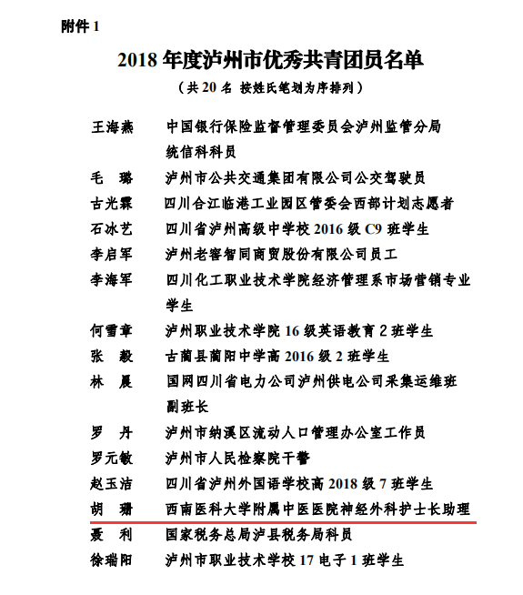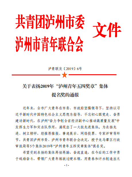近日,共青团泸州市委等部门发文,我院荣获2019年“泸州青年五四奖章”集体提名奖,神经外科护士长助理胡珊荣获泸州市“优秀共青团员”荣誉称号,中西医结合学院团总支书记苏娜荣获“优秀共青团干部”荣誉称号。