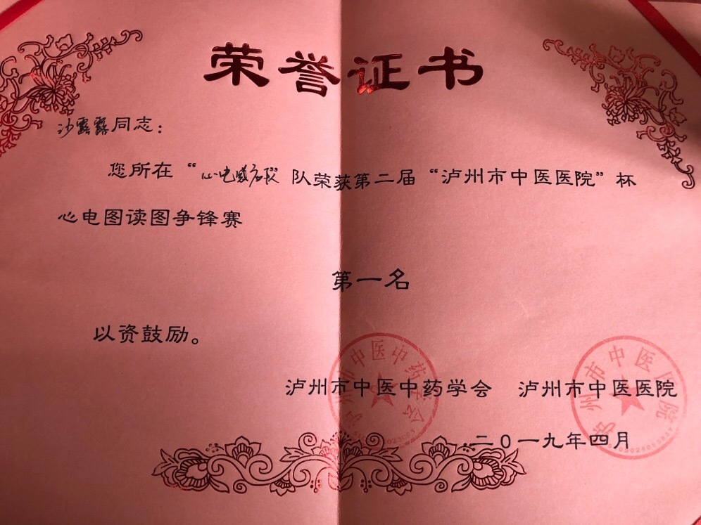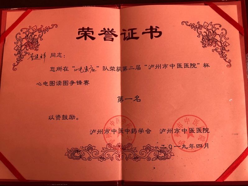 2019年4月26日,第二届“泸州市中医医院”杯心电图读图争锋赛在泸州举行,我院心脑电图室医师沙露露、李建群组队参加比赛获得第一名。