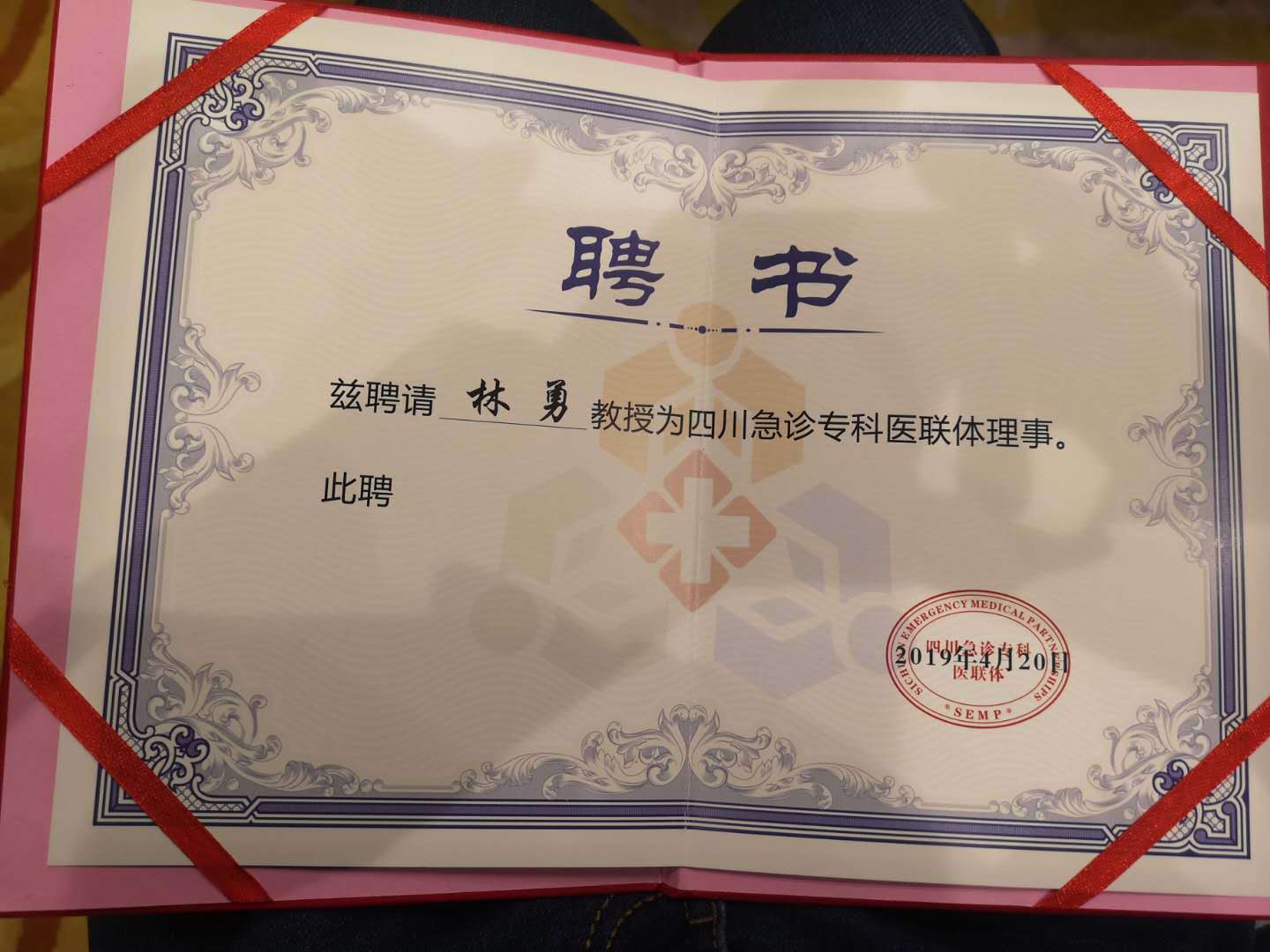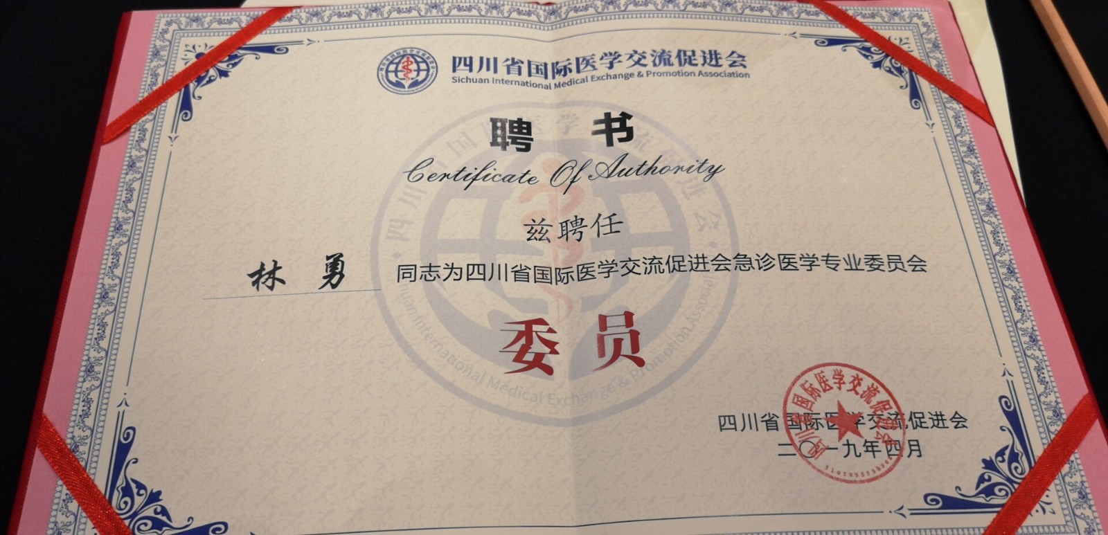 2019年4月20日,四川省国际医学交流促进会急诊医学专业委员会在成都召开,我院门诊部部长、急诊科主任林勇当选为四川急诊专科医联体理事和急诊医学专业委员会委员。