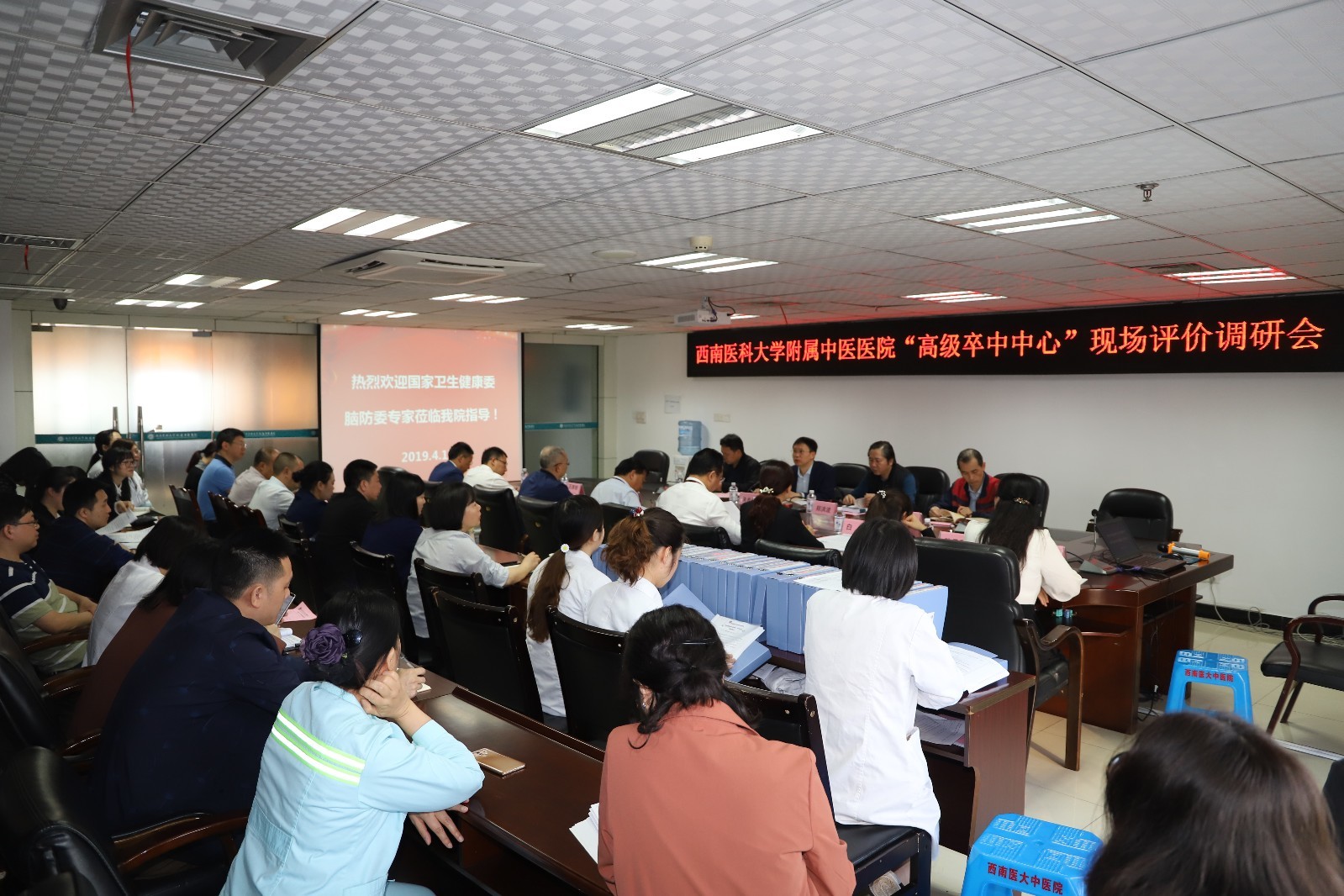 2019年4月17日,国家卫健委脑防委专家一行4人莅临我院,就我院高级卒中中心建设情况进行了现场评价调研,我院党政领导,神经内科、心血管内科、神经外科、针灸·康复科、内分泌科、急诊科、放射影像科、超声影像科等科室人员及相关职能部门负责人参加了会议。