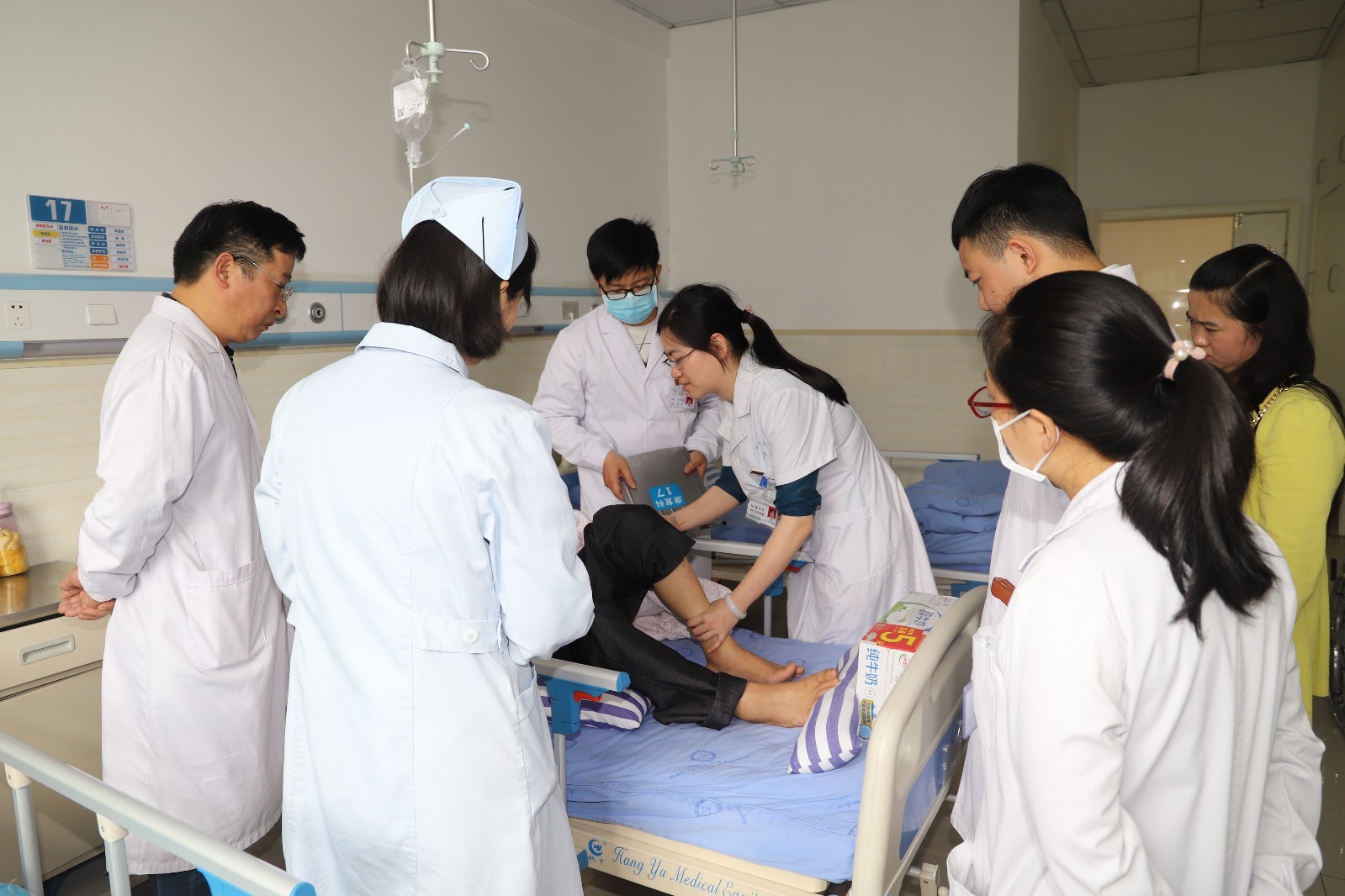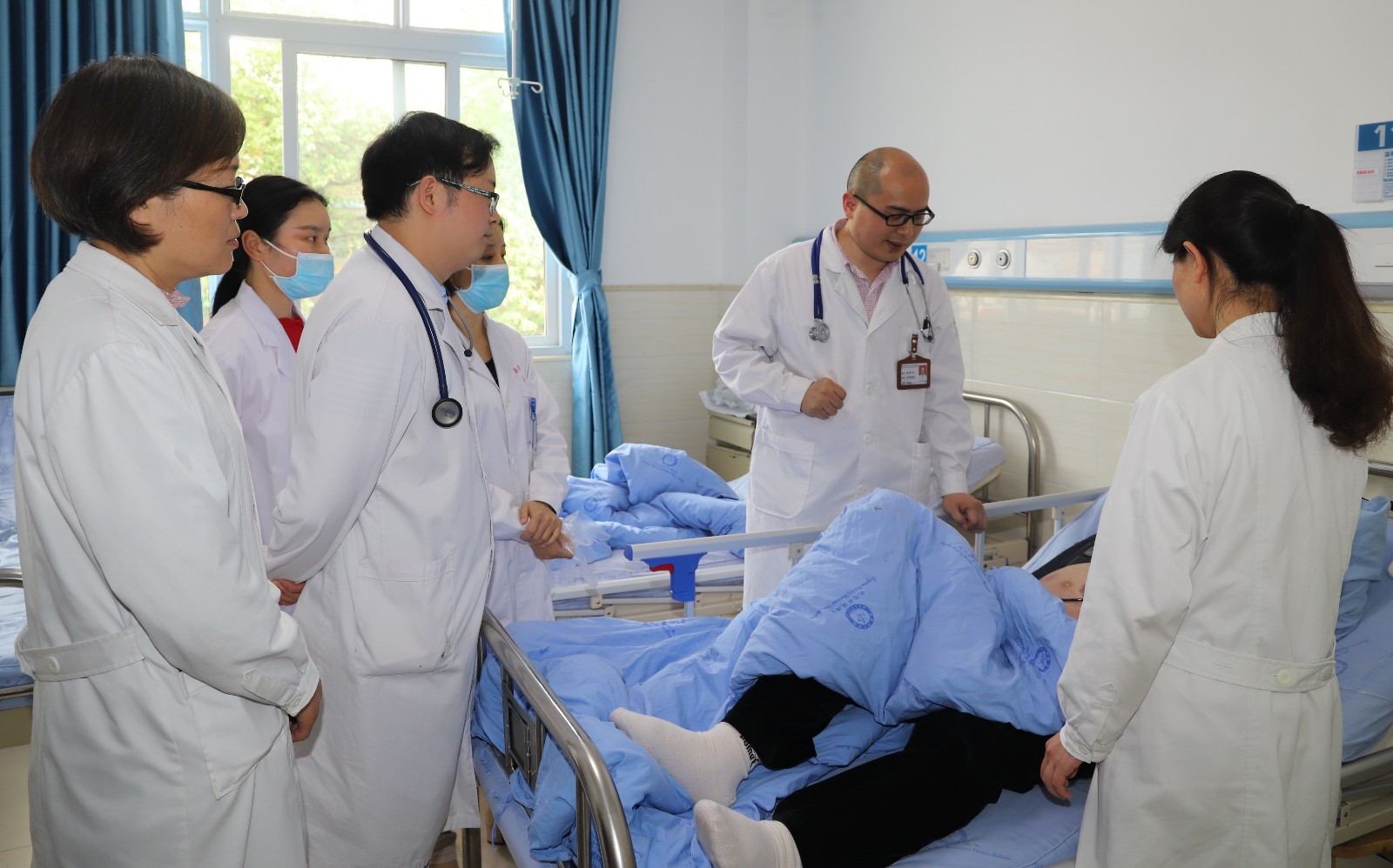 针灸·康复科主治医师陈利莎(左四)开展疑难病例查房