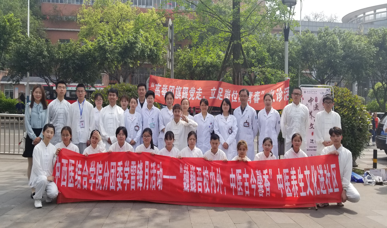 2019年4月13日,中西医结合学院分团委联合医院志愿者服务团队在白招牌社区党群服务中心开展了“巍巍吾校内外,中医古今馨香”进社区学雷锋月活动。志愿者们通过推广中医养生导引术,表演五禽戏和八段锦,讲解医学小知识,开展义诊活动等传播中医养生文化。