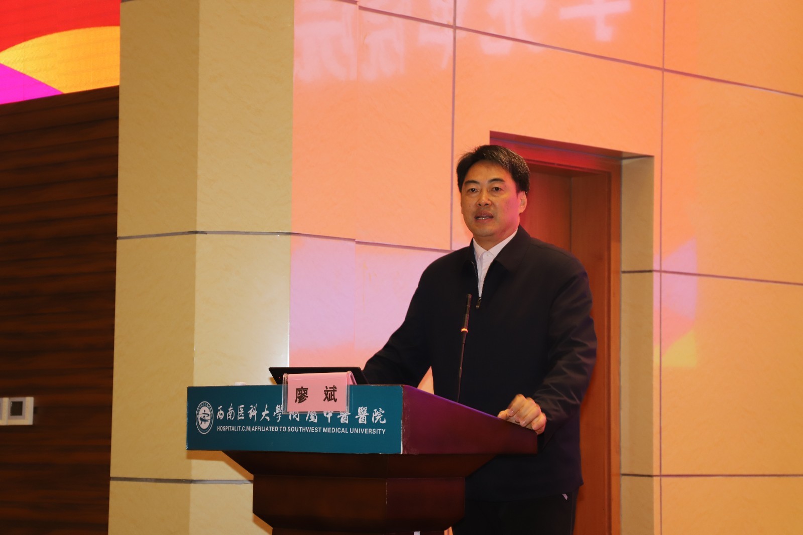 廖斌讲话,他介绍了西南医科大学基本情况,重点介绍了学校学科建设和科学研究相关工作情况,希望中西医结合学院·附属中医医院在李兆申团队的指导帮助下,在消化疾病的基础和临床研究、学科建设、技术创新和成果转化等方面有更大的进步,让泸州乃至川渝滇黔四千万群众享受到更优质的医疗服务,同时为建设“健康泸州”“健康四川”作出积极的贡献。