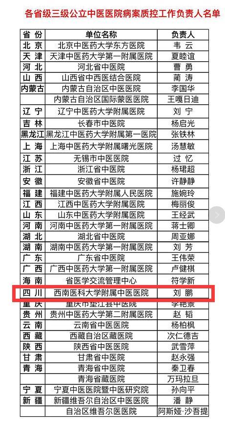 2019年3月26日,中国中医科学院中医药数据中心发布了全国各省级三级公立中医医院病案质控工作负责人名单。我院医务部部长刘鹏教授获批为四川省唯一一家省级三级公立中医医院病案质控工作负责人。