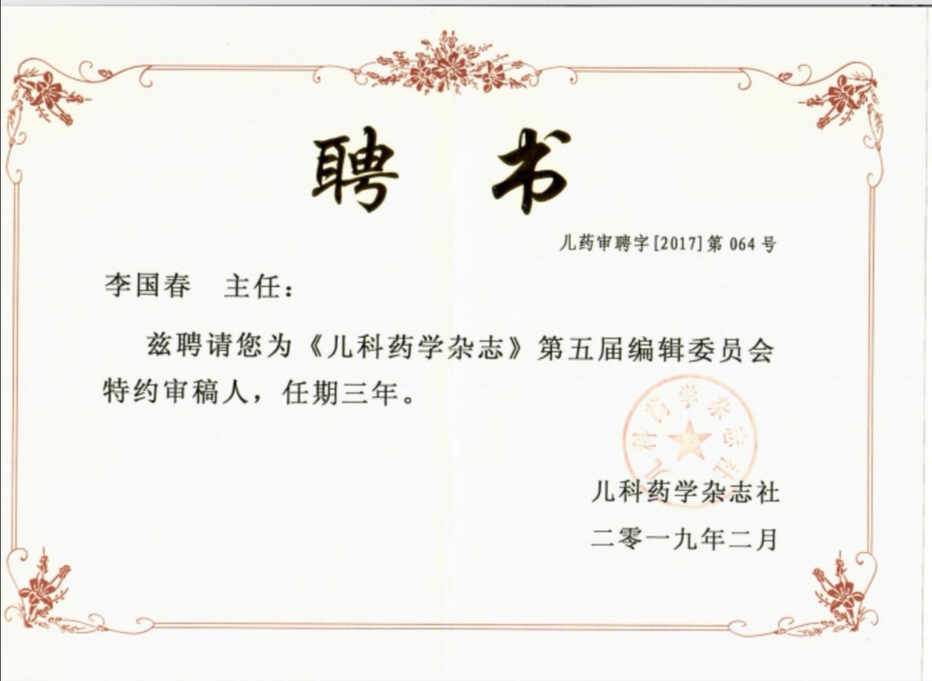 2019年2月,《儿科药学杂志》编辑委员会召开,我院静脉用药调配中主任李国春被聘为该杂志第五届编辑委员会特约审稿人。