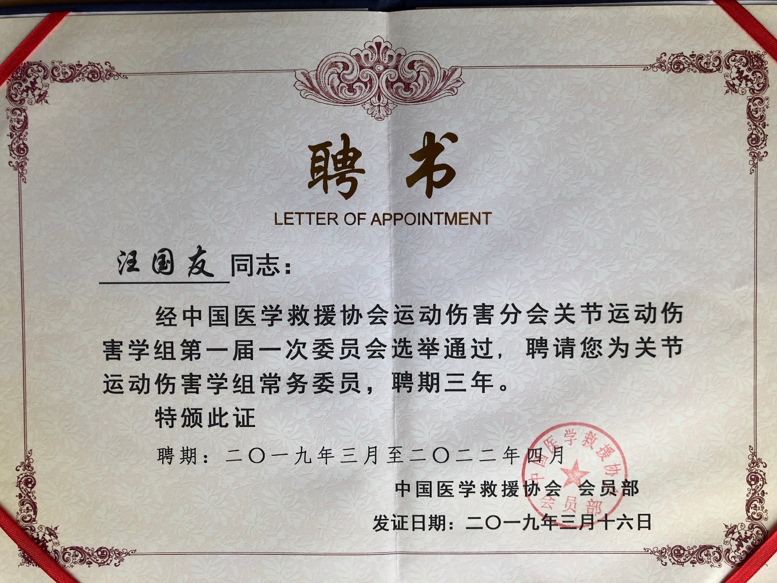 2019年3月15-17日,中国医学救援协会运动伤害分会关节运动伤害学组第一届一次委员会在广州召开,我院骨伤科(关节·足踝组)副主任汪国友副教授当选为常务委员。