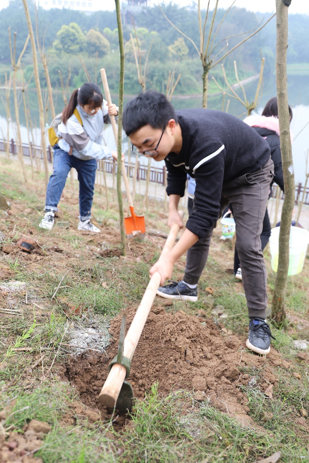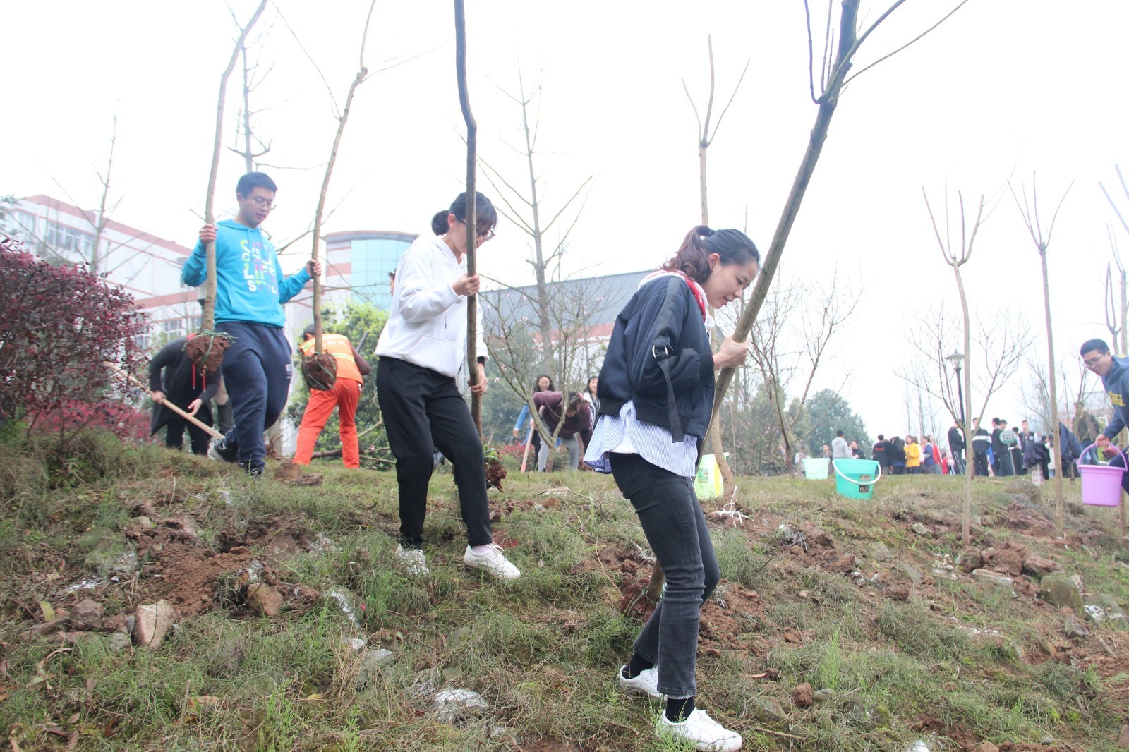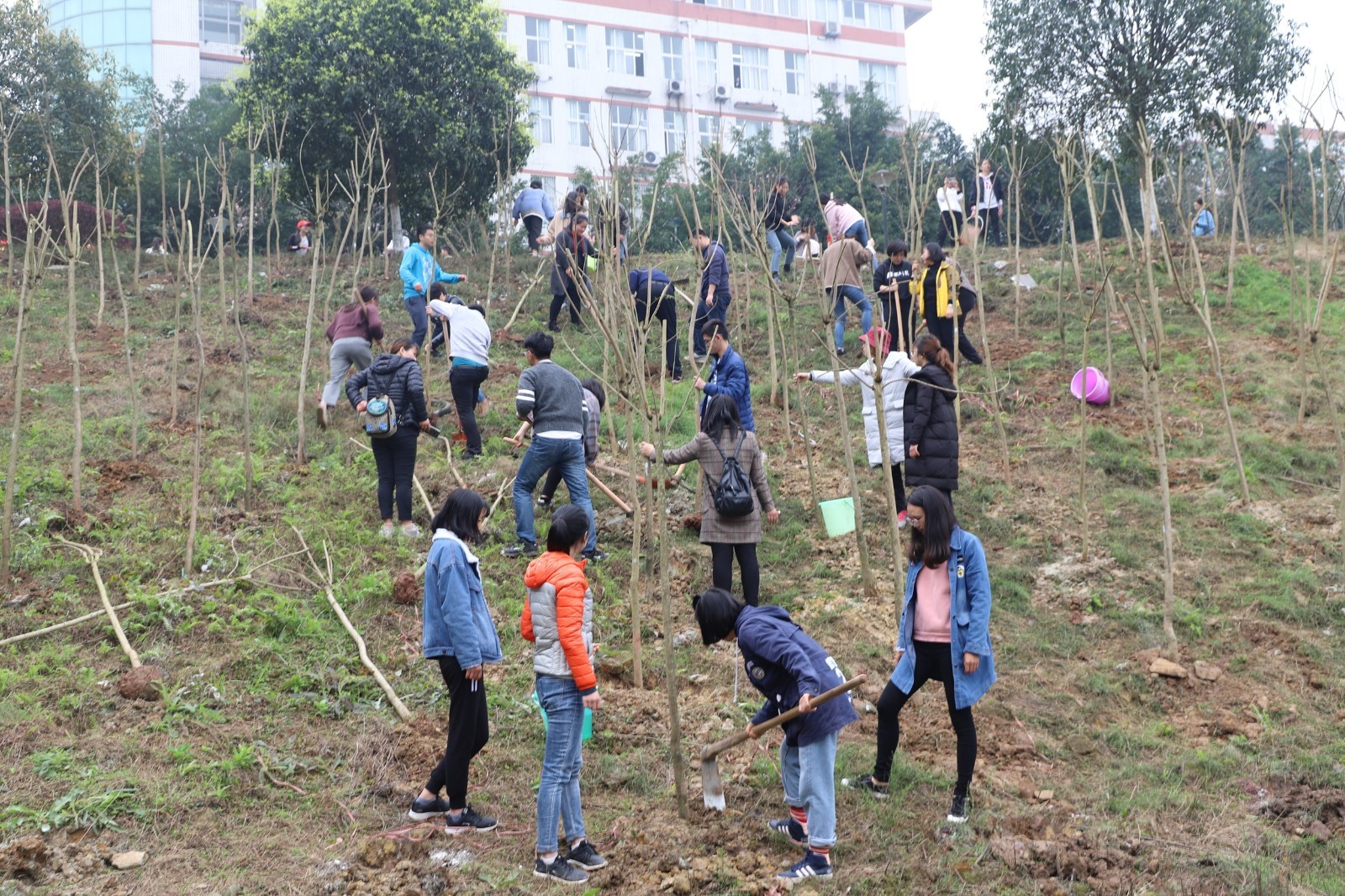 活动现场,师生们配合默契,干劲十足,共种下蓝花楹500余株。