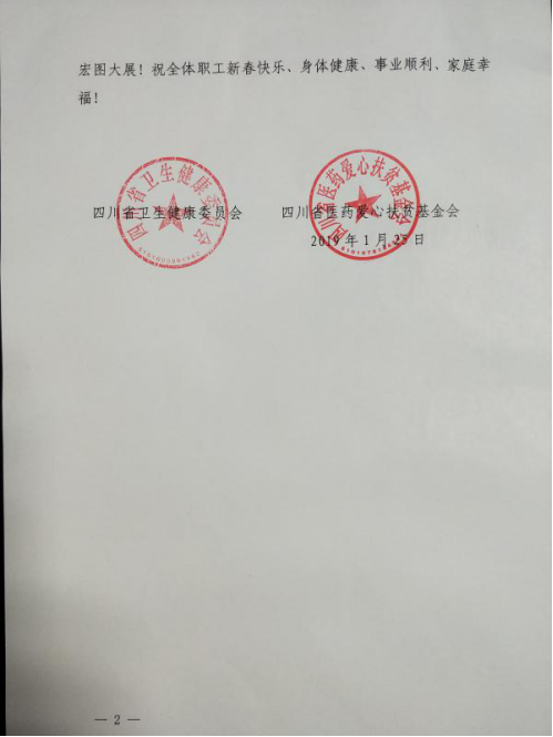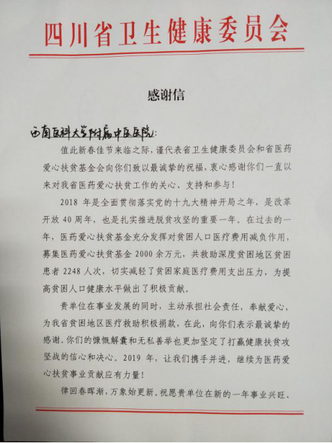 2019年新春佳节来临之际,我院收到了来自四川省卫健委、四川省医药爱心扶贫基金会的一封感谢信,信中对我院长期关心、支持、参与医药爱心扶贫工作并慷慨解囊表达了谢意。