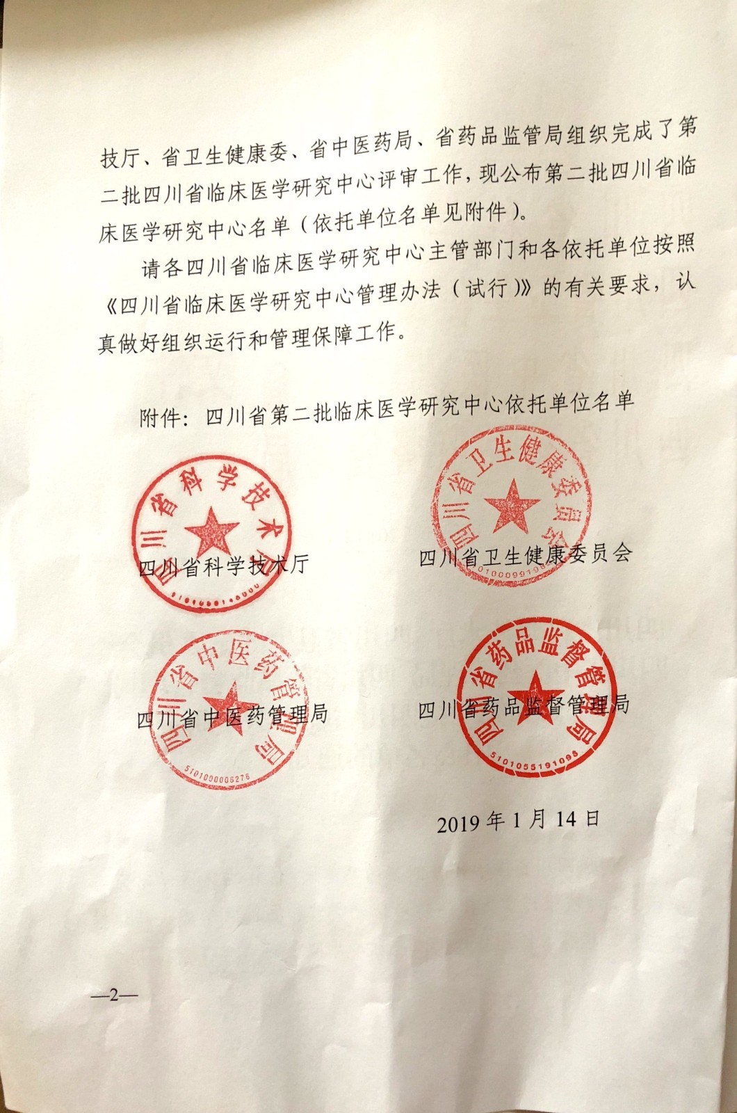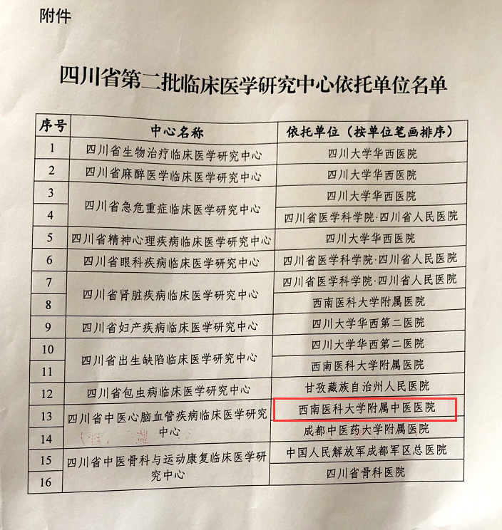 近日,四川省科学技术厅、四川省卫生健康委员会、四川省中医药管理局和四川省药品监督管理局公布了第二批四川省临床医学研究中心名单,我院获批四川省中医心脑血管疾病临床医学研究中心依托单位。