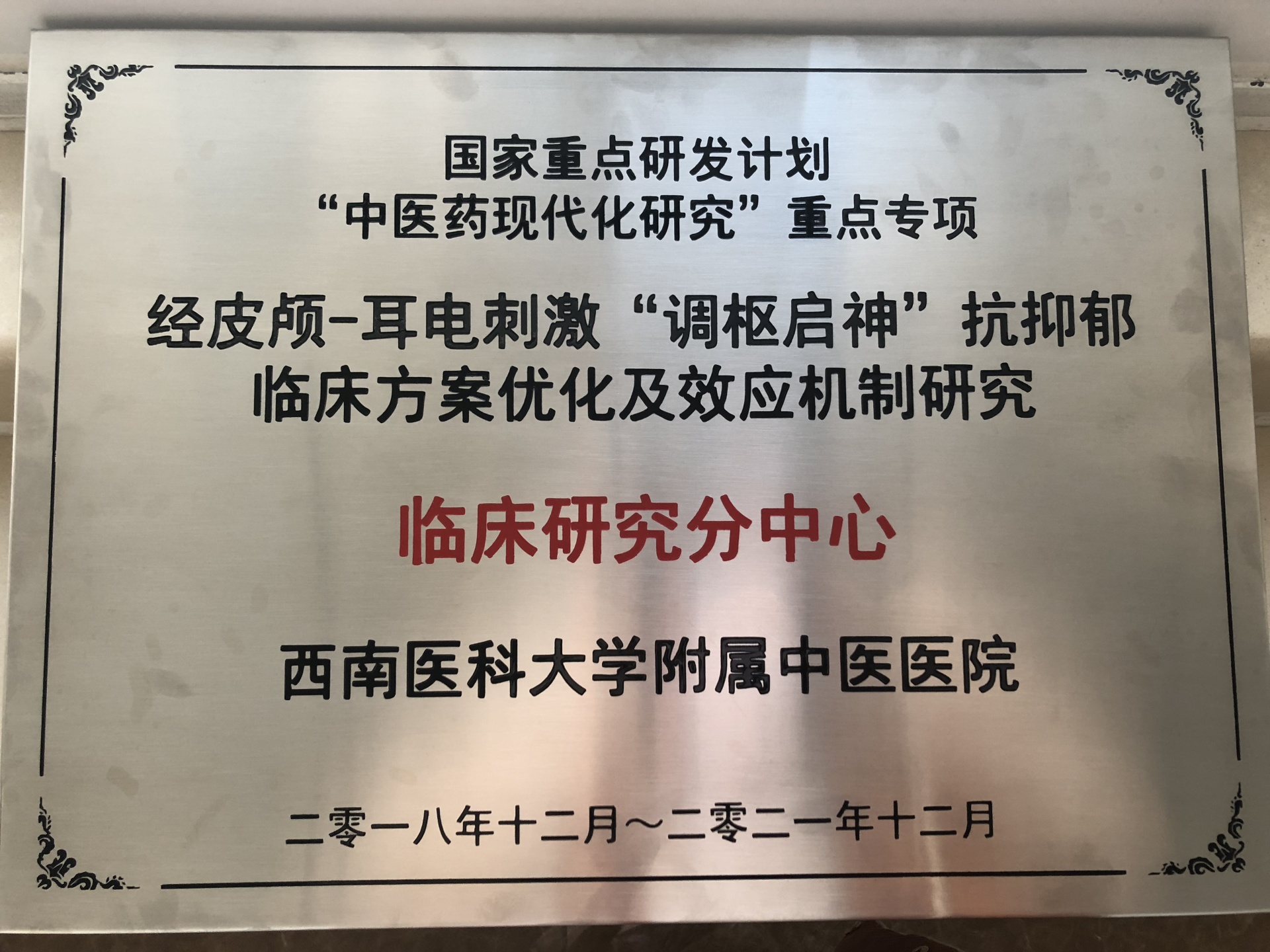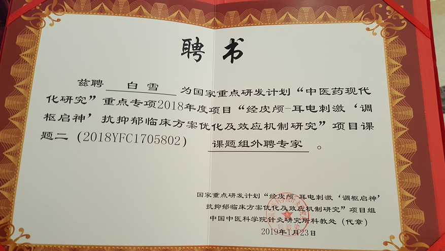 中国中医科学院针灸研究所副所长荣培晶为我院授予了国家重点研发计划“中医药现代化研究”重点项目“经皮颅~耳电刺激‘调枢启神’抗抑郁临床方案优化及效应机制研究临床研究中心的牌子,医院大内科兼心脑病科主任白雪教授受聘为国家重点研发计划“中医药现代化研究”重点专项2018年度“经皮颅~耳电刺激‘调枢启神’抗抑郁临床方案优化及效应机制研究”项目课题组外聘专家。