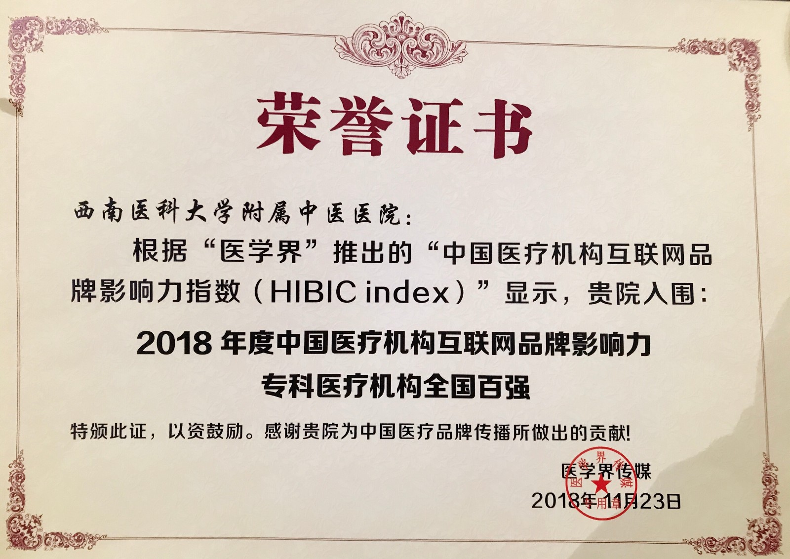 会上,组委会联合新媒体大数据权威平台清博指数、知名全国就医指导平台微医和复旦大学健康传播研究所共同发布“中国医疗机构互联网品牌影响力指数(HIBIC index)”排行榜,对全国4000多家医疗机构品牌宣传工作进行盘点和评价。我院荣获2018年度中国医疗机构互联网品牌影响力专科医疗机构全国百强、2018年度中国医疗机构互联网品牌影响力地级市医疗机构全国50强。
