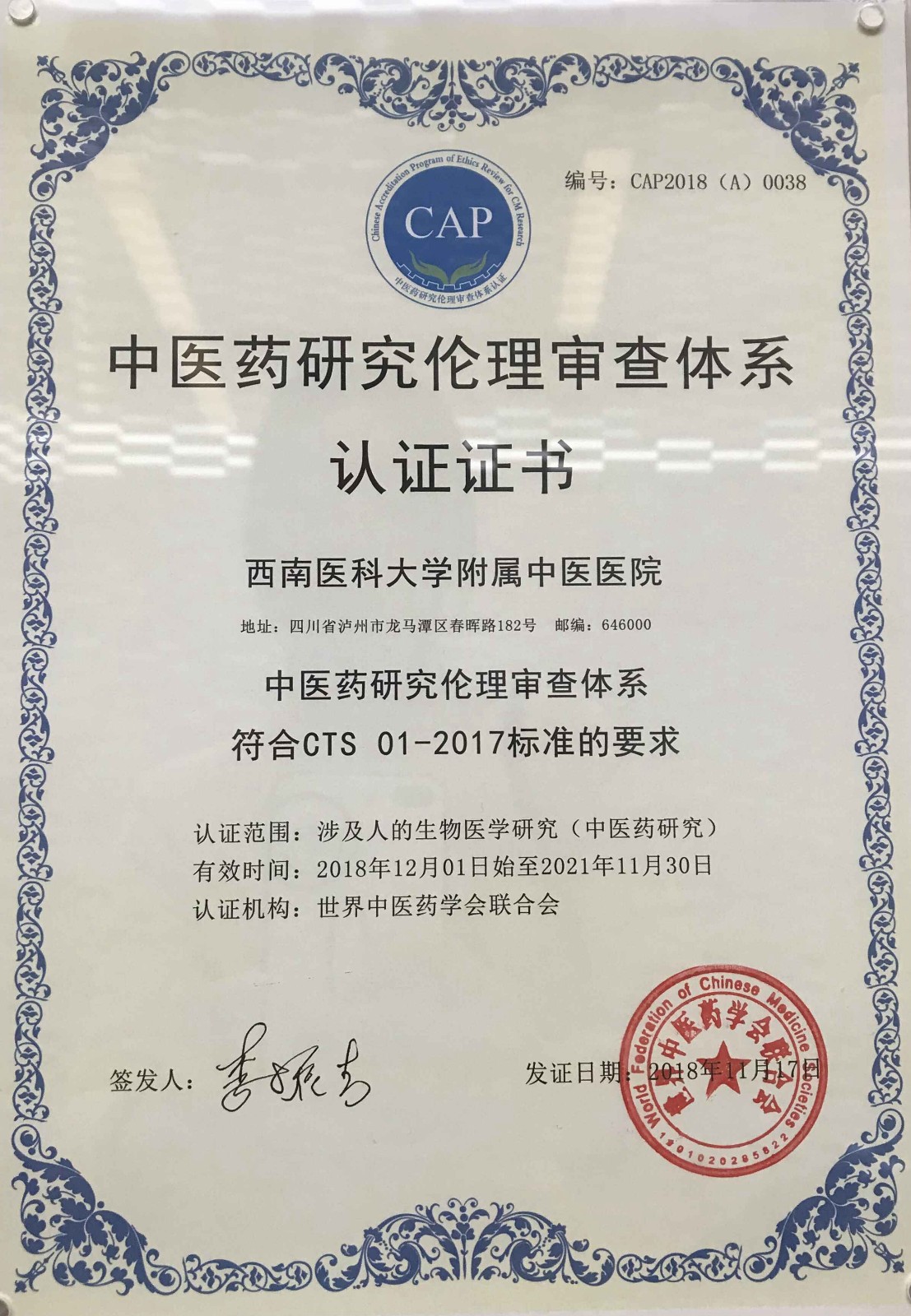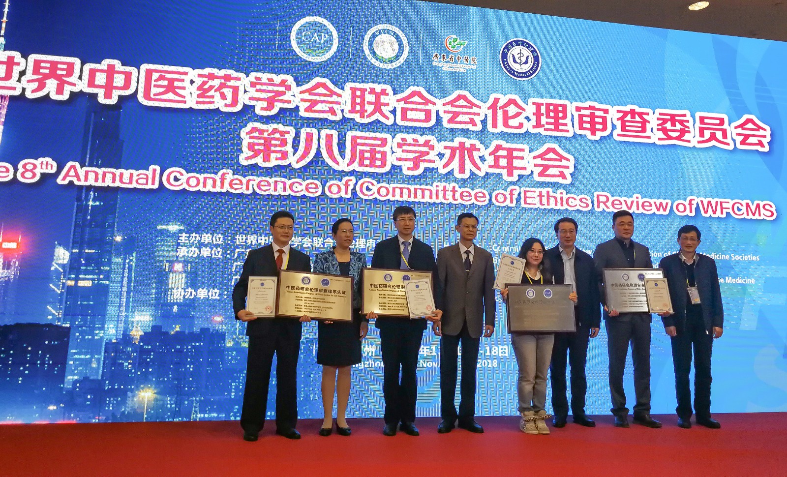 2018年11月17日,世界中医药学会联合会伦理审查委员会第八届学术年会在广州举行,会上对2018年顺利通过中医药研究伦理审查体系(CAP)认证的医院颁发了证书和奖牌。