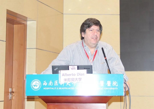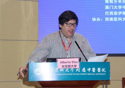 Alberto Dias教授讲话,他希望通过中国-葡语系国家和地区“一带一路”中医药国际合作基地(四川)和中葡中医药国际合作中心的成立,与知名专家共同探讨中国-葡语系国家的中医药国际合作的发展方向。