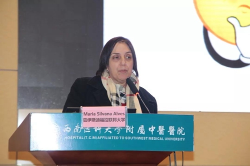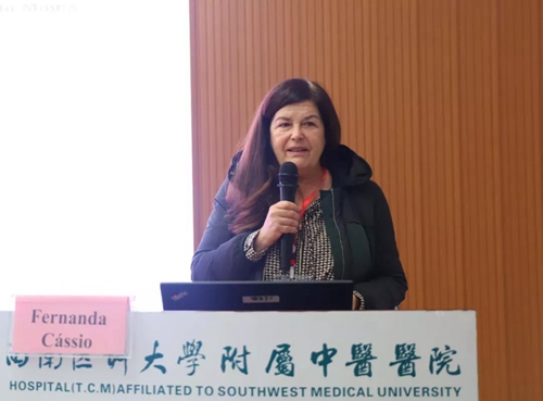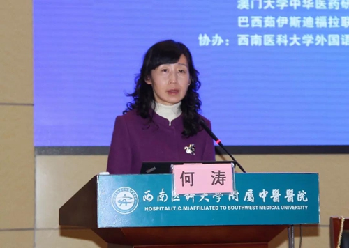 何涛讲话,她介绍了西南医科大学基本情况后希望此次会议的国内外专家学者进一步探讨中医药国际合作发展方向,西南医科大学将联合世界知名专家共同为医学教育事业作出努力和贡献。
