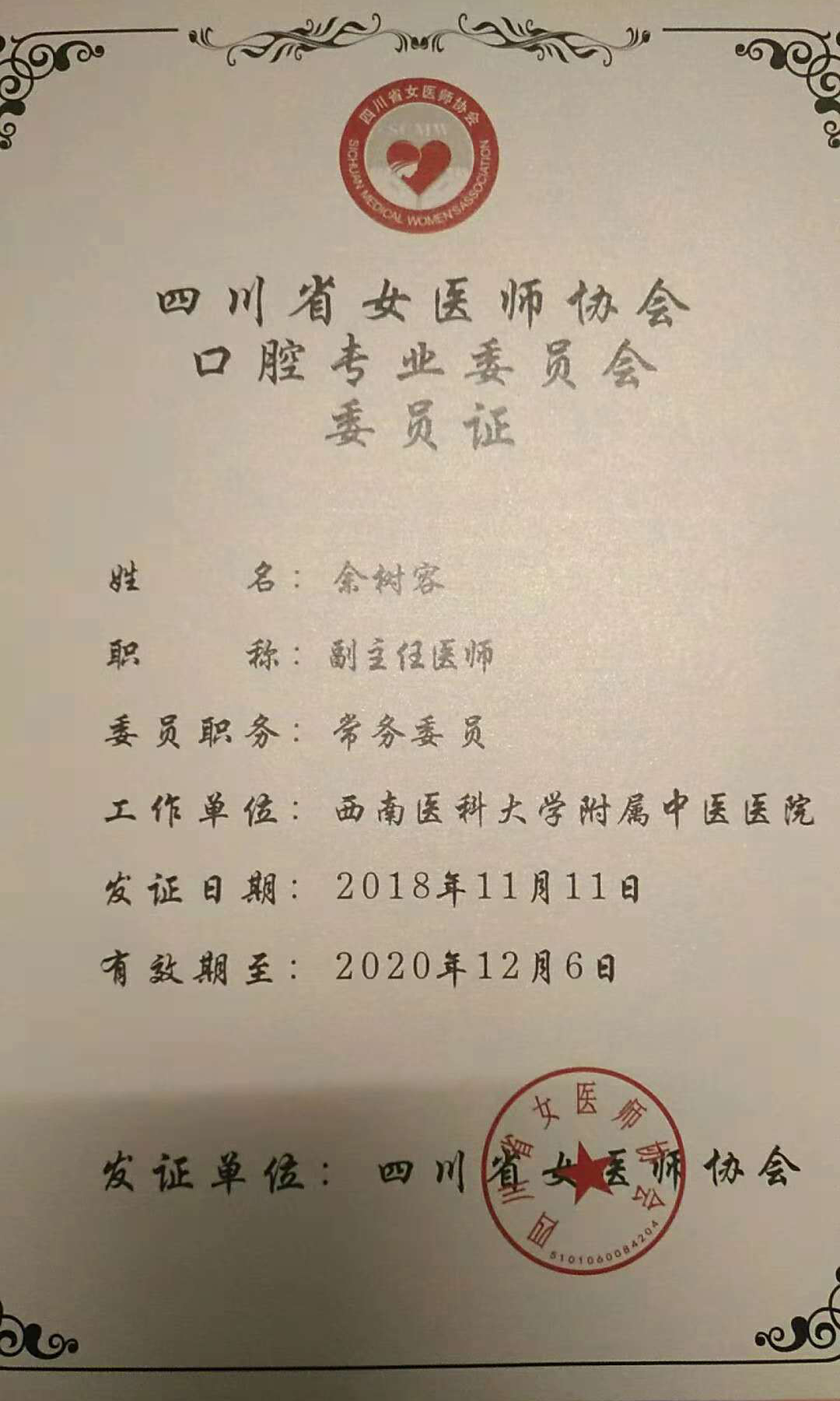 2018年11月11日,四川省女医师协会周年庆典暨2018年学术交流会在成都国际会议中心举行,我院口腔科副主任余树容副教授当选四川省女医师协会口腔专业委员会常务委员。