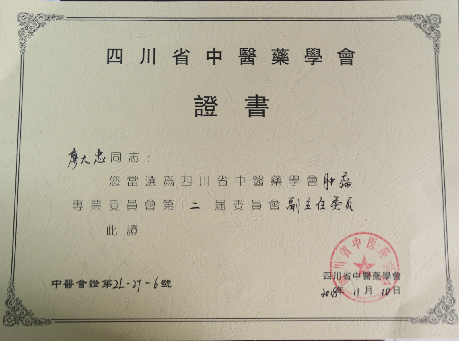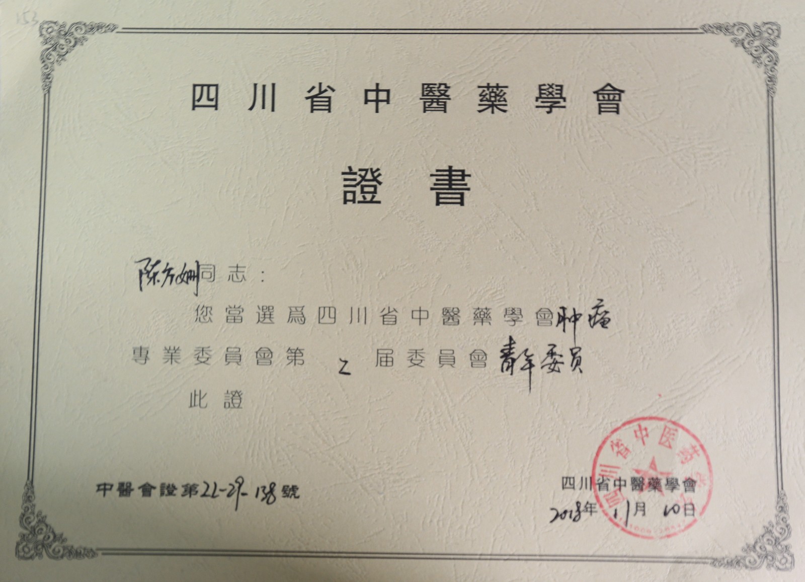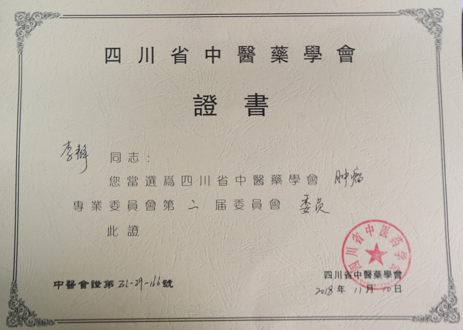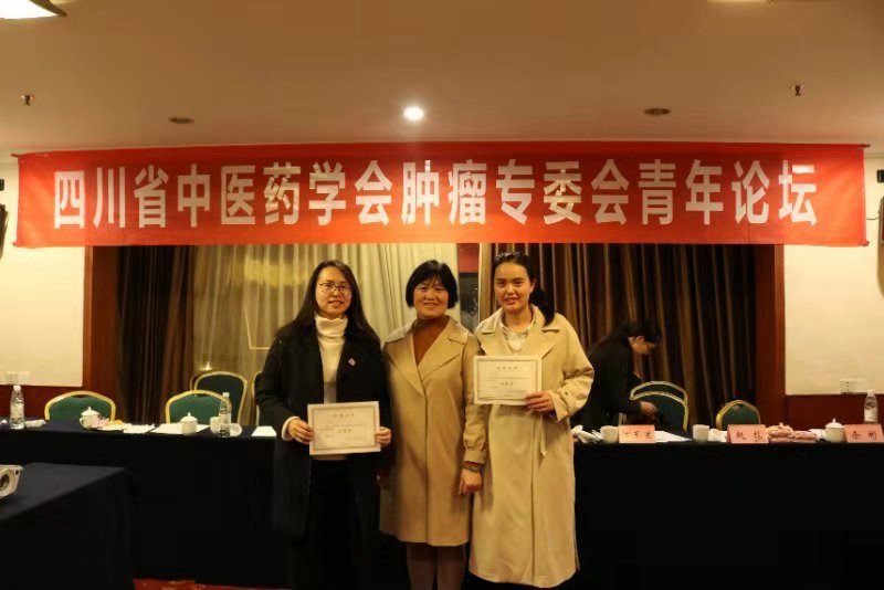 2018年11月9-10日,四川省中医药学会肿瘤专业委员会换届选举暨2018学术年会国家继教项目《玄府生理病理与临床》在成都召开。我院肿瘤·血液病科(忠山院区)主任廖大忠副教授当选为副主任委员,肿瘤·血液病科(城北院区)主任杨忠明教授、肿瘤·血液病科(忠山院区)主任助理张燕当选为常务委员,肿瘤·血液病科(忠山院区)主任助理刘福蓉、肿瘤·血液病科副主任李静当选为委员,陈方姗当选为青年委员,严佳佳荣获四川省中医药学会肿瘤专业委员会青年论坛二等奖。