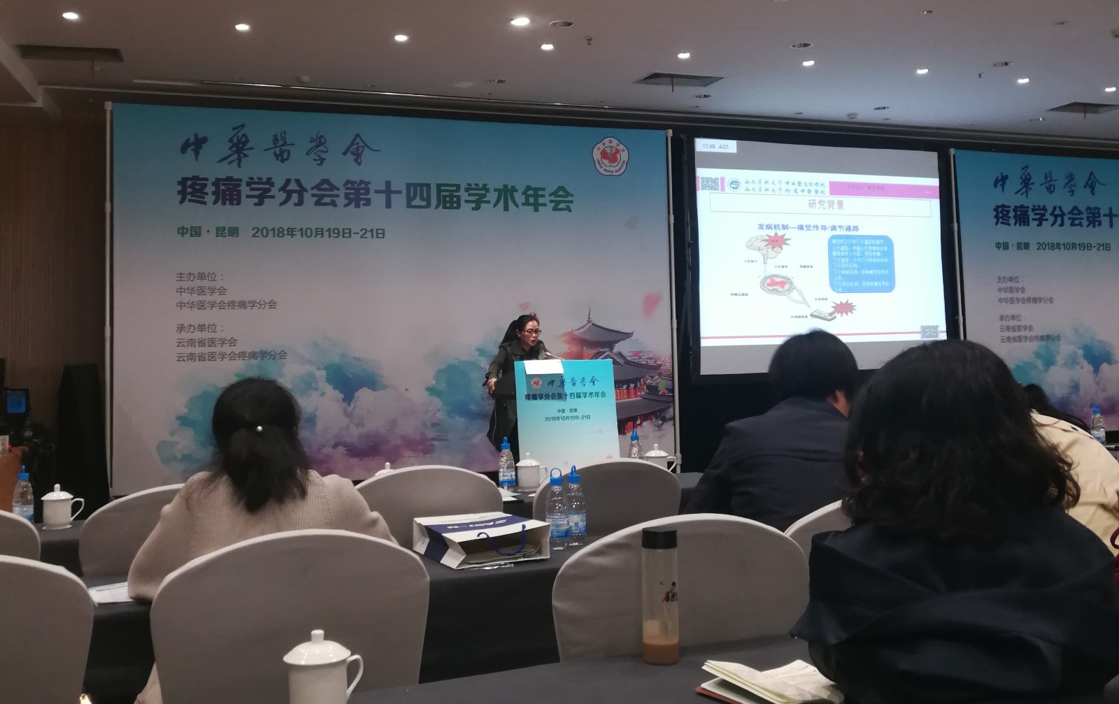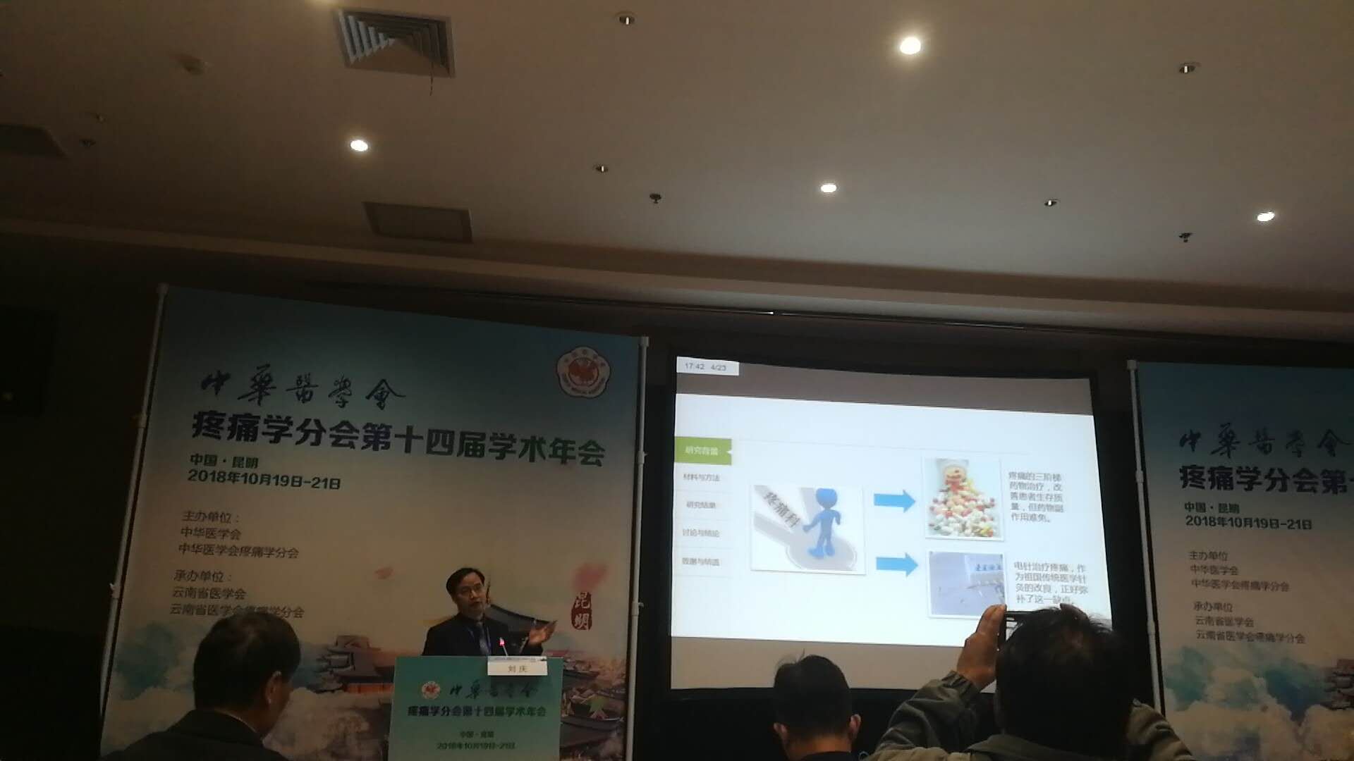 2018年10月19-21日,中华医学会疼痛学分会第十四届学术年会在昆明召开。我院疼痛科兼麻醉科主任刘庆教授、副主任张英教授在会上分别作了《电针刺激“足三里”对急性疼痛大鼠的镇痛作用及其机制研究》《心理干预对神经病理性疼痛的治疗作用及机制研究》专题讲座。