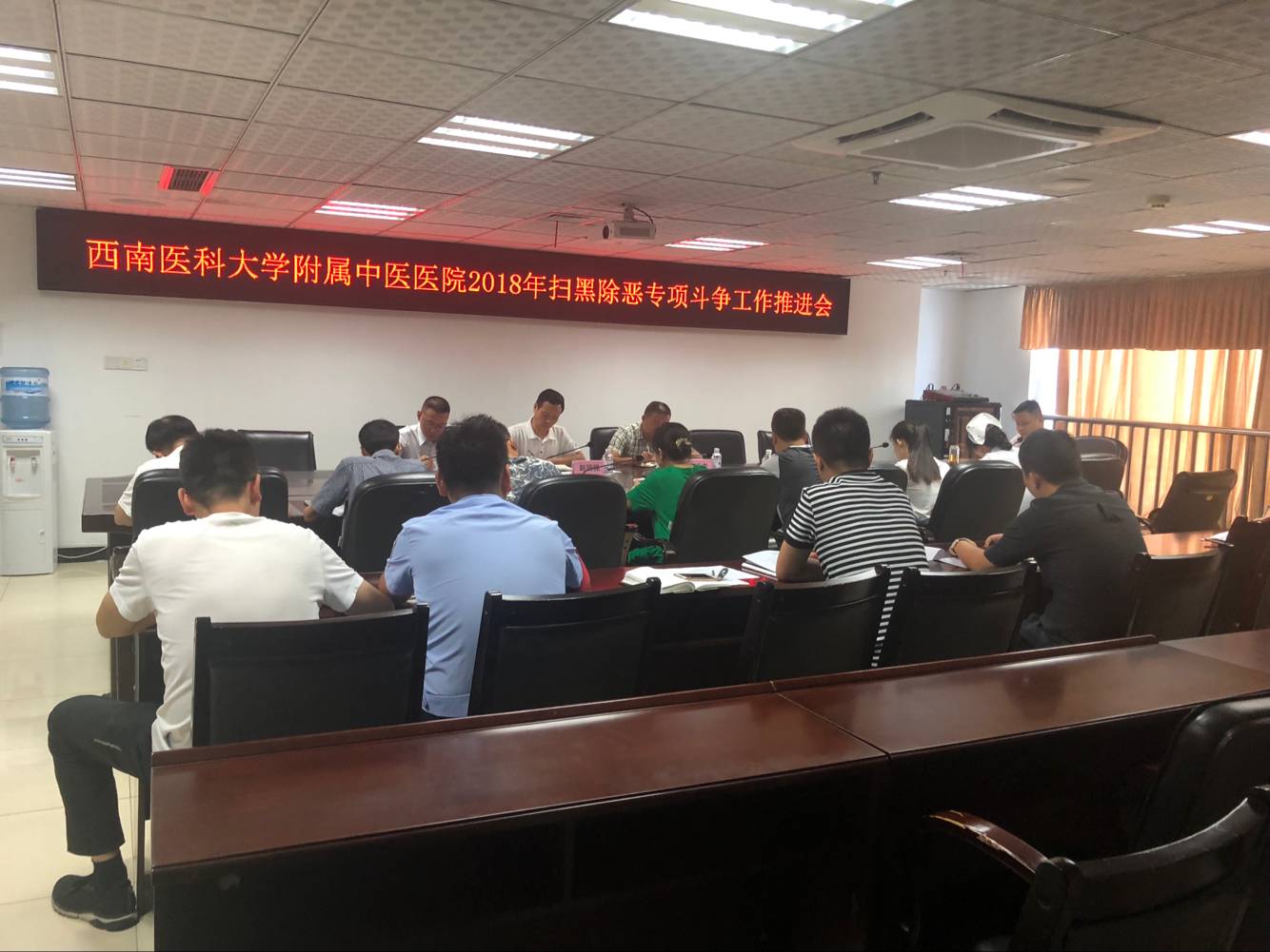 2018年9月4日,我院在岐黄厅召开了扫黑除恶专项斗争工作推进会,会议由党委副书记兼纪委书记赵国强主持,副院长谢长友和院长助理徐厚平及相关行政部门负责人、医院警务室警务人员、福建瑞泉护理服务公司负责人等参加了此次会议。