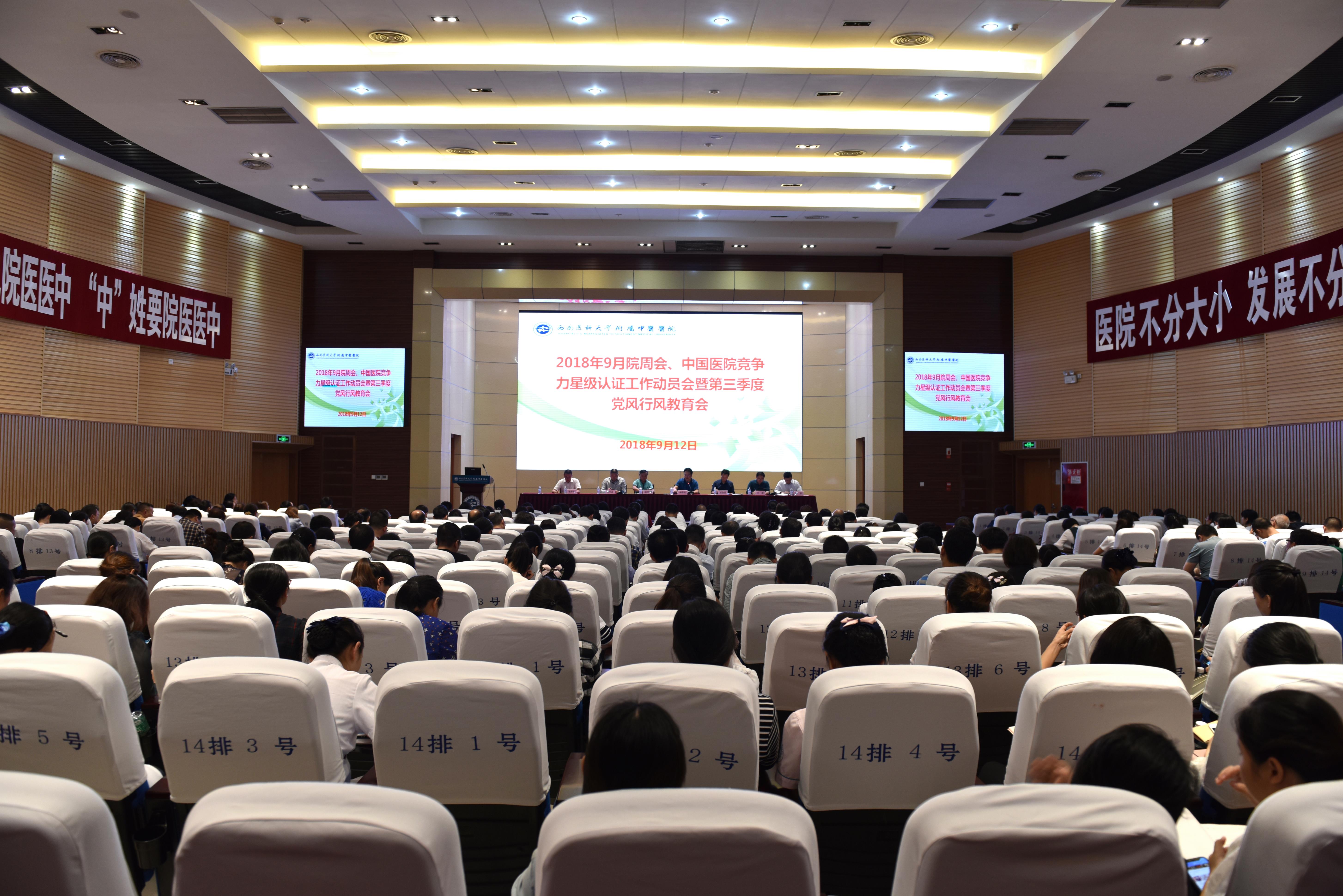 2018年9月12日,我院召开9月院周会、中国医院竞争力星级认证工作动员会暨第三季度党风行风教育会,医院党政领导,职能部门负责人、临床及辅检部门科主任、负责人、护士长及重点岗位人员等参加了会议。
