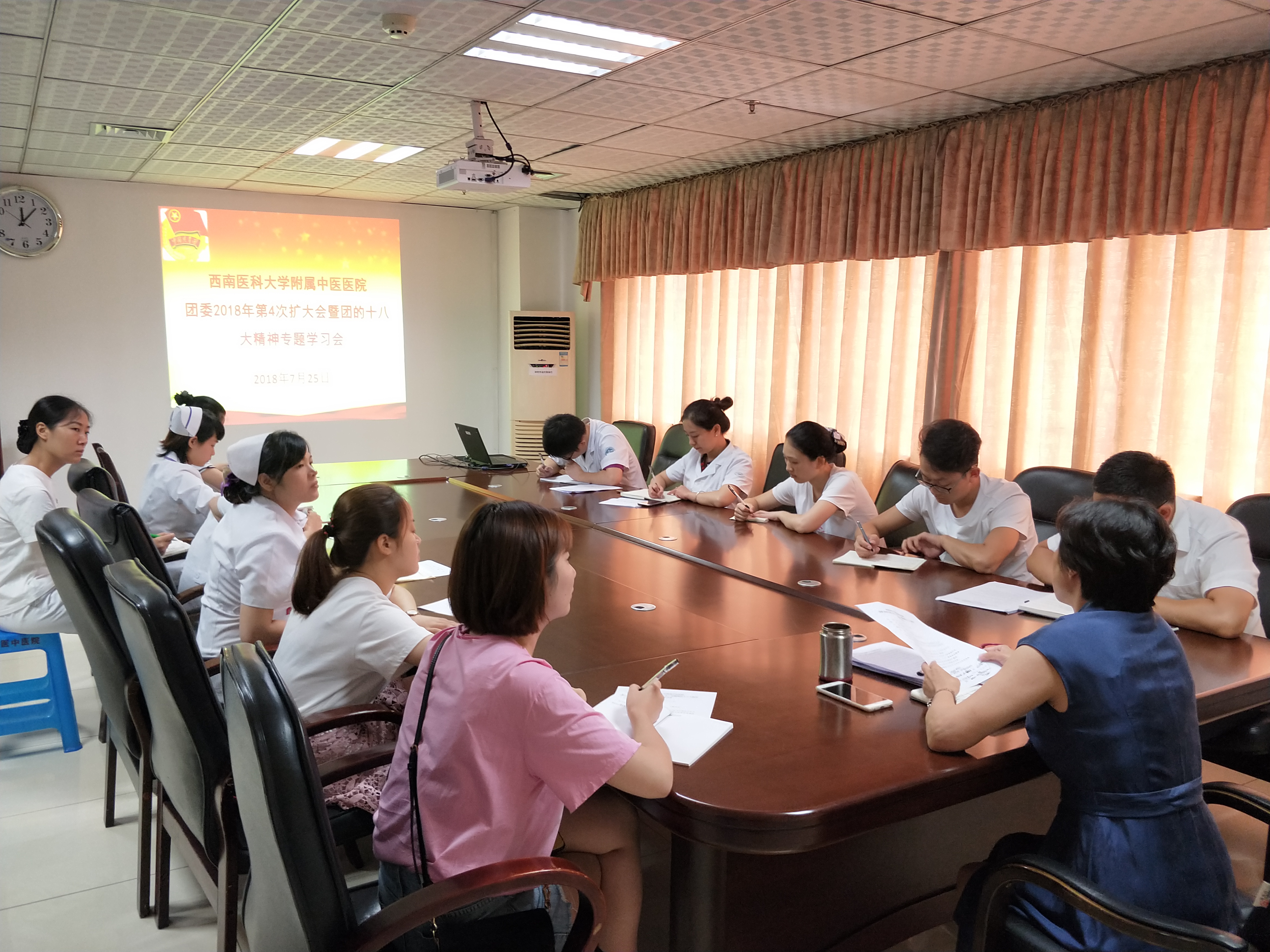2018年7月25日,我院团委在杏林厅召开了团委2018年第4次(扩大)会暨团的十八大精神专题学习会,全体团委委员、团支部书记参加了会议,医院党委书记王琳出席了本次会议,会议由医院团委书记郭鹏飞主持。