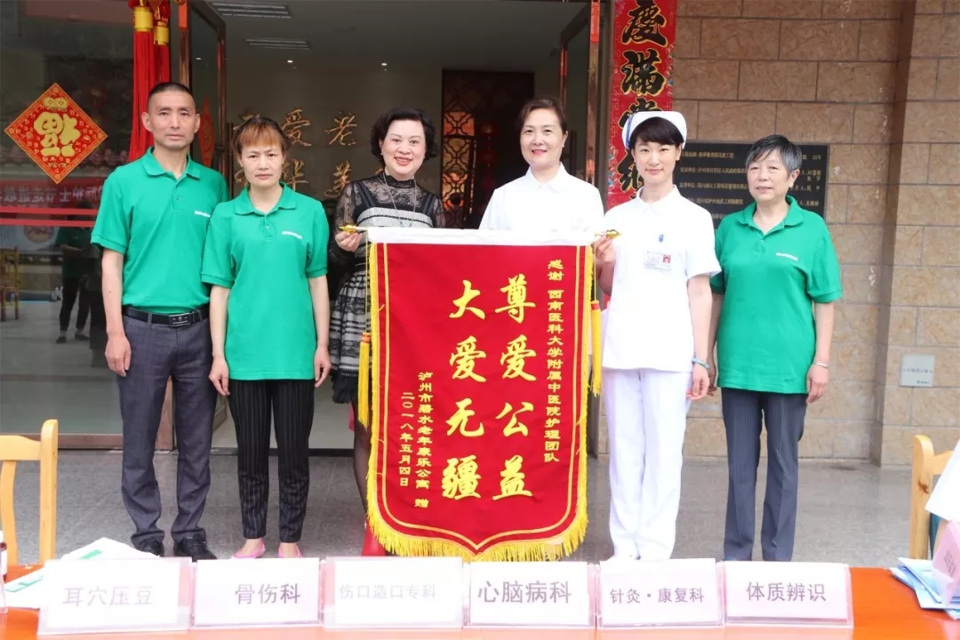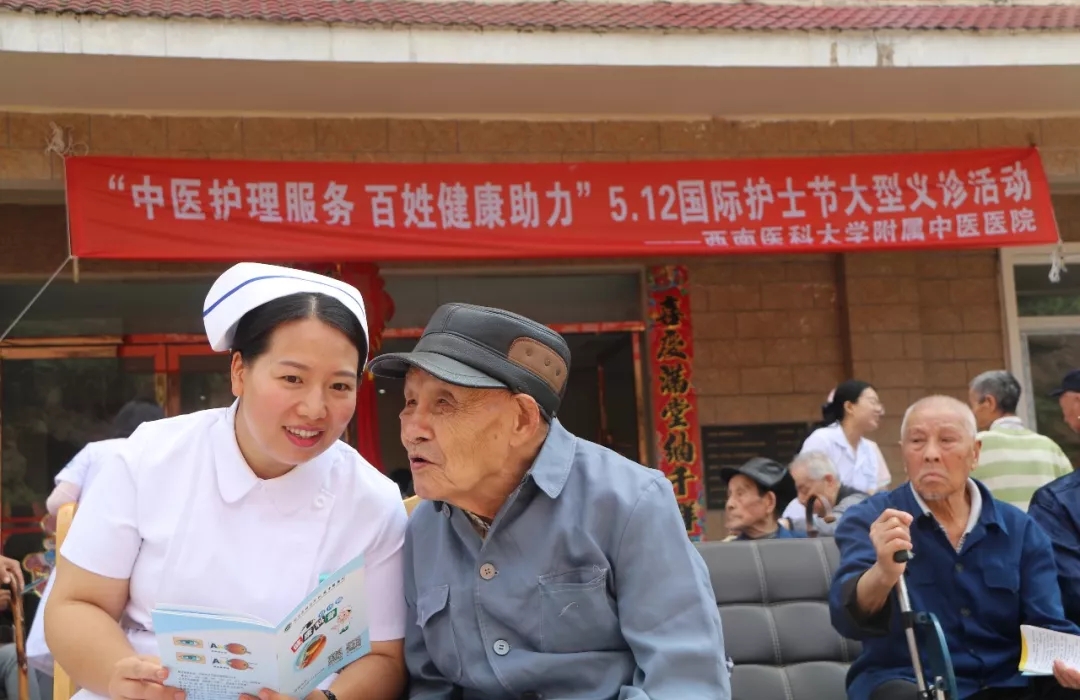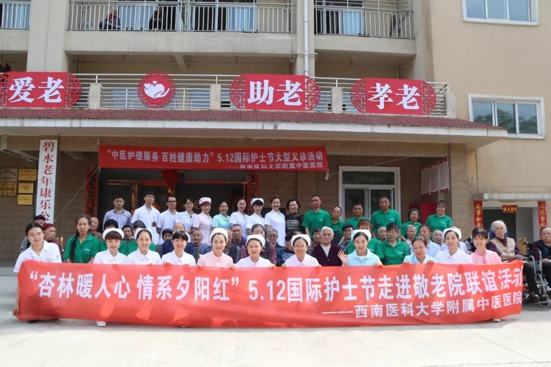 2018年5月4日,西南医大中医院心脑病科、骨伤科(创伤组)、眼科、针灸·康复科,护理部中医护理小组、糖尿病护理小组、伤口护理小组的专家们走进碧水老年康乐公寓,举行“杏林暖人心 情系夕阳红”5·12国际护士节走进敬老院联谊活动。为老人现场义诊,进行心肺复苏急救技能、八段锦、降压操演示,体质辨识和健康科普宣教,送去温暖。