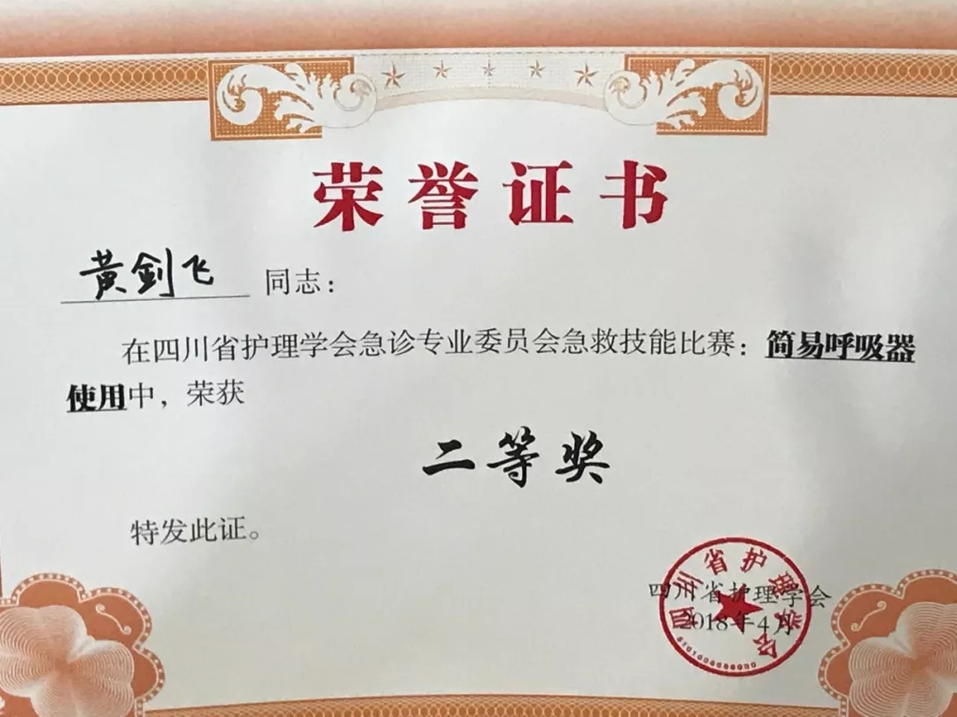 2018年4月18日,四川省护理学会“2018年强质量·重内涵急救技能大赛”在成都举行,西南医科大学附属中医医院城北急诊科护士长助理黄剑飞荣获简易呼吸器使用二等奖,水井沟急诊科副护士长邓钰荣获单人心肺复苏术三等奖。