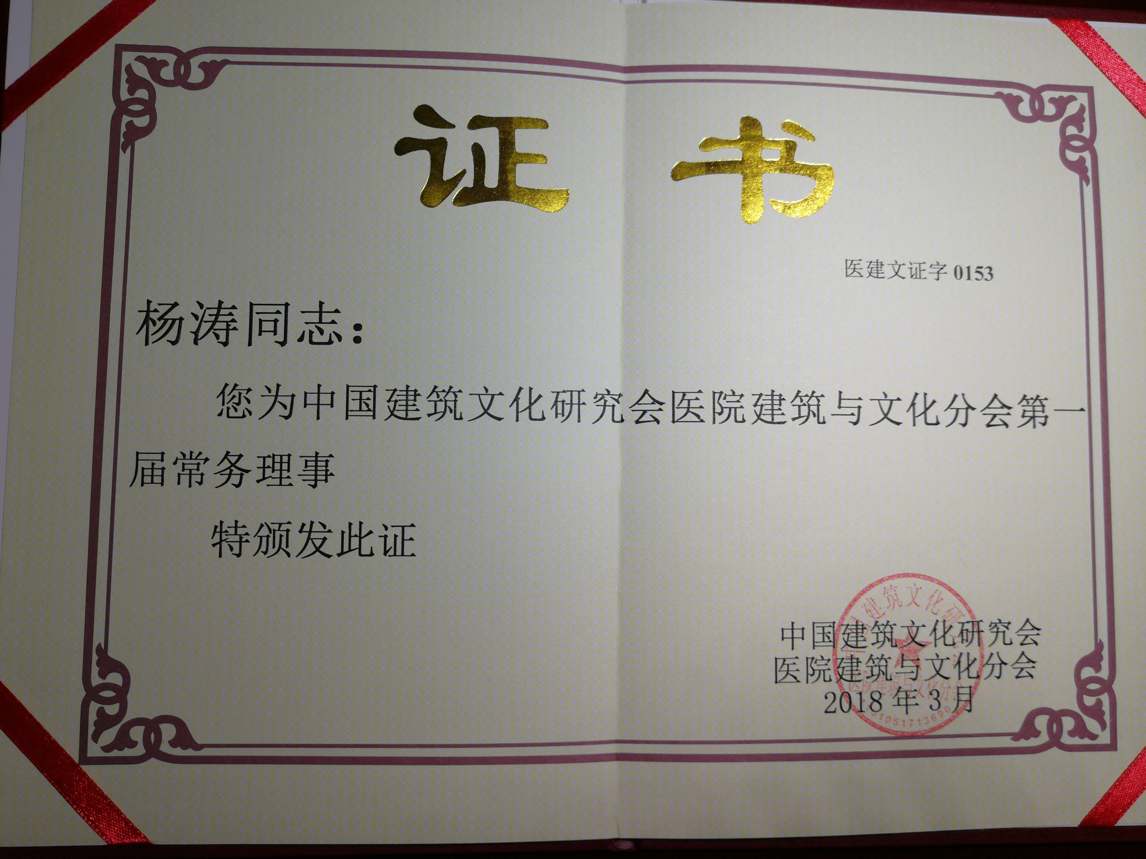 2018年3月30日,中国建筑文化研究会医院建筑与文化分会成立大会在南京召开,西南医科大学附属中医医院设备保障部部长杨涛当选常务理事。