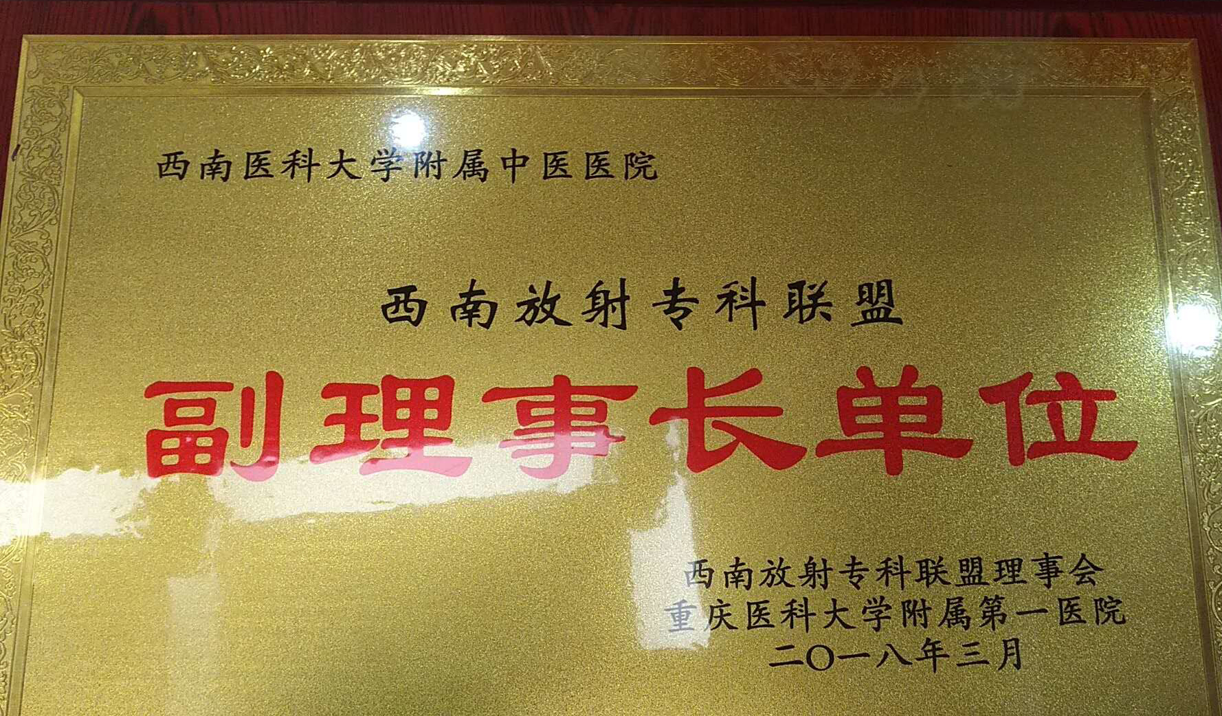 2018年3月31日,西南放射专科联盟成立暨授牌大会在重庆召开,西南医科大学附属中医医院成为联盟副理事长单位。