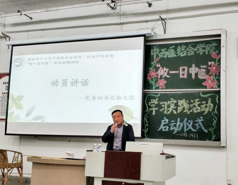 2018年4月1日,西南医科大学附属中医医院中西医结合学院举行“做一日中医”学习实践活动启动仪式暨岗前培训会,党委副书记杨文信,相关职能部门负责人以及部分辅导员、2017级全体学生参加了仪式。