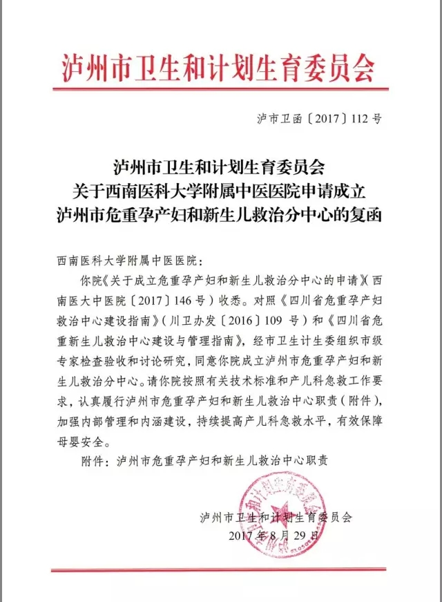 近日,我院“危重孕产妇和新生儿救治分中心”顺利通过泸州市卫计委评审验收,成功获批为“泸州市危重孕产妇和新生儿救治分中心”。 我院将继续认真履行危重孕产妇和新生儿救治中心的职责,高标准执行产儿科急救要求,持续提高产儿科急救水平,有效保障母婴安全。