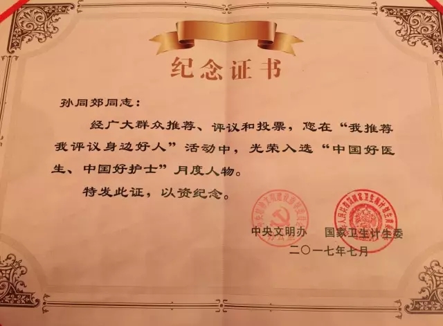 2017年8月31日,全国道德模范与身边好人“中国好医生、中国好护士”(浙江专场)现场交流活动在浙江省人民大会堂举行。首批“中国好医生、中国好护士”月度人物上榜名单正式公布。西南医科大学附属中医医院教授孙同郊入选“中国好医生、中国好护士”7月月度人物。 他们是千千万万好医生、好护士的代表,为他们点赞!向所有医护人员致敬!