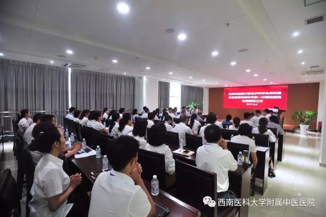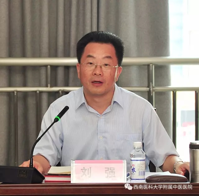 刘强讲话,他介绍了泸州市医疗卫生资源分布概况及医药产业园的建设情况后,对西南医科大学附属医院及附属中医院提出以下要求:打造政、产、学、研、地联盟;进一步加大人才培养力度,特别是药学及相应专业学科的人才;加强校地合作;继续把药物临床试验队伍做优做强,为泸州市医药产业的发展作出贡献,服务地方经济及社会发展。
