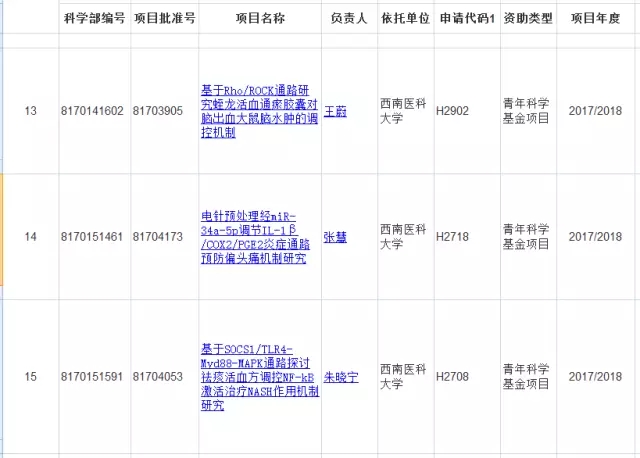 2017年8月17日,国家自然科学基金中标项目公布,我院心脑病科主治医师王蔚博士的《基于Rho/ROCK通路研究蛭龙活血通瘀胶囊对脑出血大鼠脑水肿的调控机制》、肝胆病科主治医师朱晓宁的《基于SOCS1/TLR4-Myd88-MAPK通路探讨祛痰活血方调控NF-kB激活治疗NASH作用机制研究》和针灸教研室张慧博士的《电针预处理经miR-34a-5p调节IL-1β/COX2/PGE2炎症通路预防偏头痛机制研究》中标。