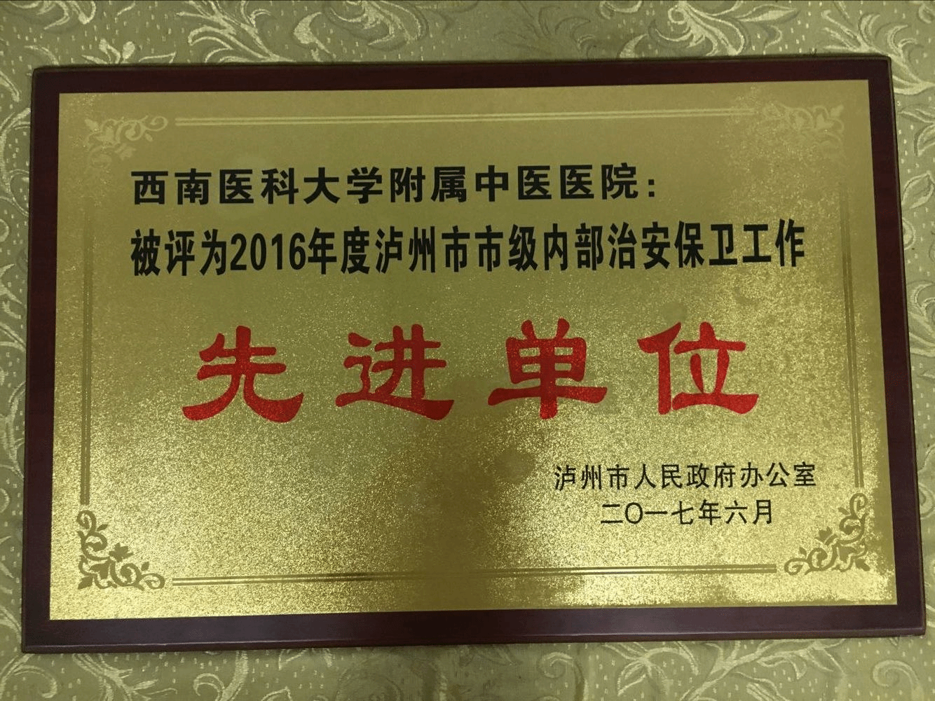 2017年7月26日,2017年全市重点内保单位工作会在泸州市公安局办案中心召开。我院荣获“2016年度泸州市市级内部治安保卫工作先进单位”荣誉称号。