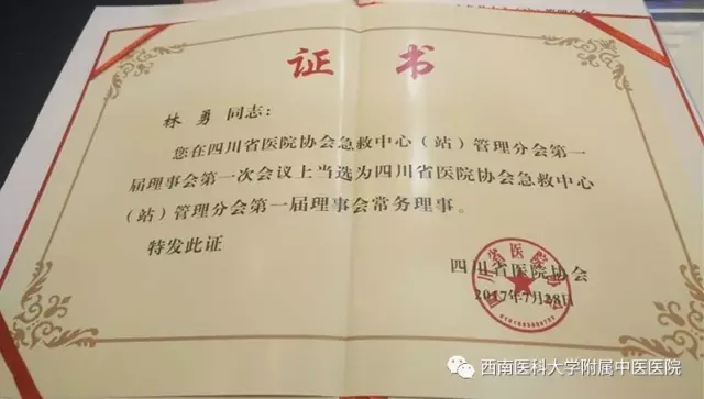 2017年7月28日,由四川省医院协会举办的四川省医院协会急救中心(站)管理分会第一届理事会第一次会议在成都召开。会议上,我院门诊部部长兼急诊科主任林勇副教授当选为四川省医院协会急救中心(站)管理分会第一届理事会常务理事。