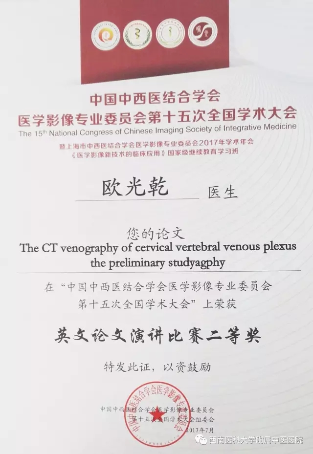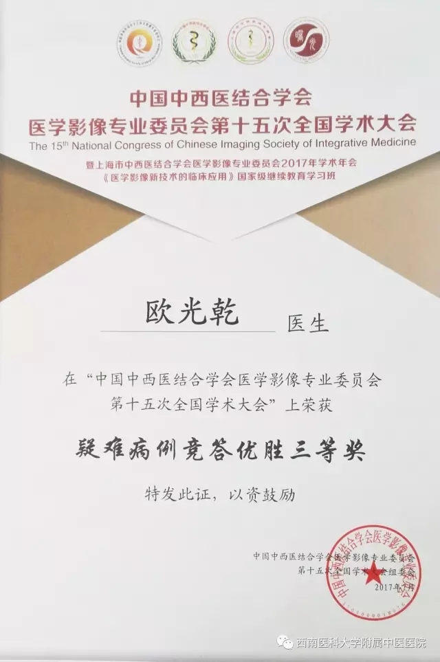中国中西医结合学会医学影像专业委员会第十五次全国学术大会于2017年7月14-15日在上海召开,我院放射影像科斯光晏主任率队参加大会。我院放射影像科副主任刘勇教授受邀作大会主题发言,放射影像科主任助理欧光乾主治医师参加英文论文比赛并获得全国二等奖及病例讨论大赛并获得全国三等奖。青年医生宋震宇参加了大会交流。