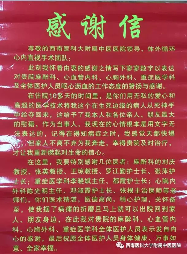 出院之时,患者还特意将面锦旗和一封感谢信送给西南医大中医院,说“真的很感谢你们,为我做这么多!”