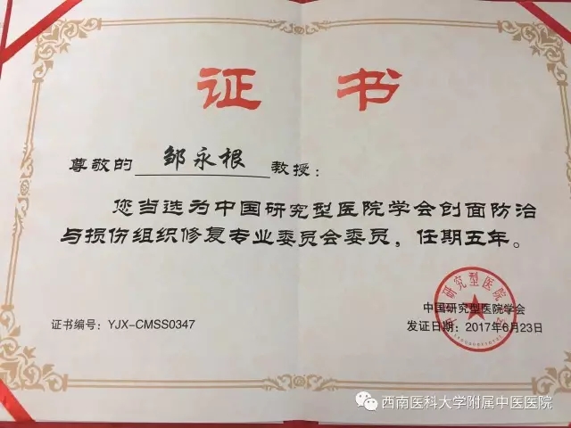 另讯,6月22-25日,中国研究型医院学会创面防治与损伤组织修复专业委员会成立大会在遵义召开,我院骨伤科(矫形·儿骨·手外组)副主任邹永根副教授当选为中国研究型医院学会创面防治与损伤组织修复专业委员会委员。