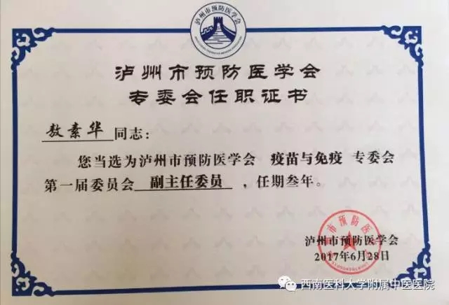 2017年6月28日,泸州市预防医学会疫苗与免疫专业委员会成立暨首次学术会议在泸州召开,我院呼吸内科主任敖素华教授当选为泸州市预防医学会疫苗与免疫专委会第一届委员会副主任委员。