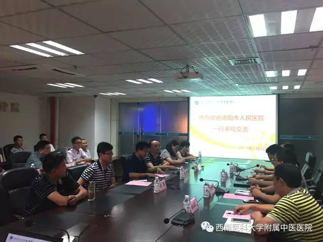 2017年6月8日,德阳市中医医院中医科主任周荣及泸州百草堂中药饮片有限公司董事长王胜及相关职能部门负责人来到我院参观交流,我院副院长李志及相关职能部门负责人参加了座谈会。 座谈会上,双方就药房管理、中医临床等方面进行了交流。