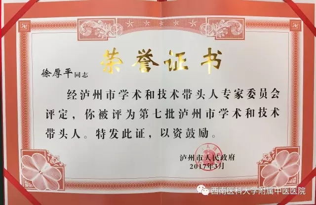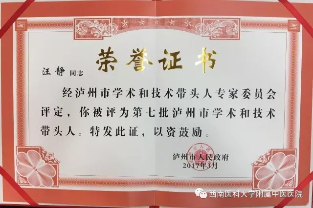 同时,中共泸州市委、泸州市人民政府公布了第七批泸州市学术和技术带头人名单,我院院长助理徐厚平博士、大内科副主任兼肝胆病科主任汪静教授被批准为第七批泸州市学术和技术带头人。