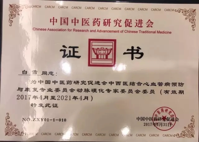 2017年4月2日,中国中医药研究促进会中西医结合心血管疾病预防与康复专业委员会召开,我院大内科兼心脑病科主任白雪教授当选为委员。