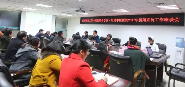 2017年1月18日,西南医科大学附属中医医院举行了新闻宣传工作座谈会,委书记王琳,相关职能部门负责人以及华西都市报城市读本、四川在线、四川新闻网、泸州日报、川江都市报、泸州新闻网、泸州电视台、泸州交通广播电台、川南在线、酒城新报、信息周刊、腾讯大成网以及泸州论坛等14家媒体记者参加了会议。会议由王琳主持。 会上,宣传部负责人向与会媒体汇报了西南医科大学附属中医医院2016年宣传工作情况。