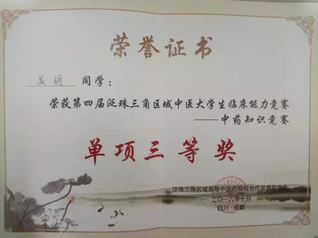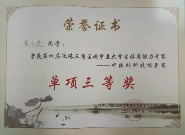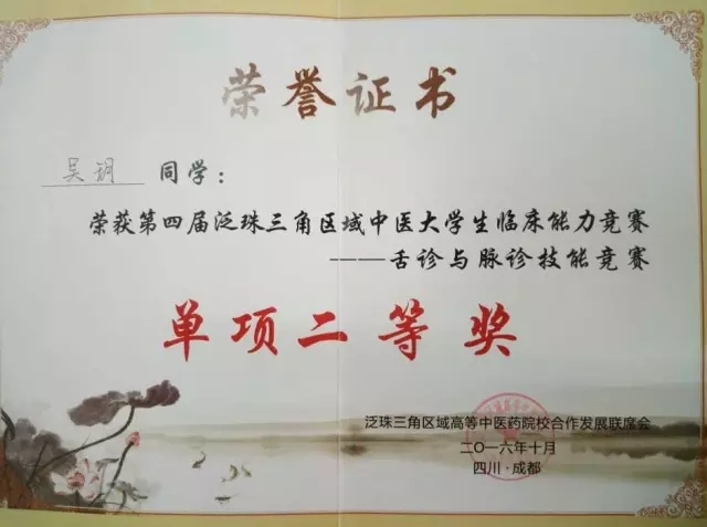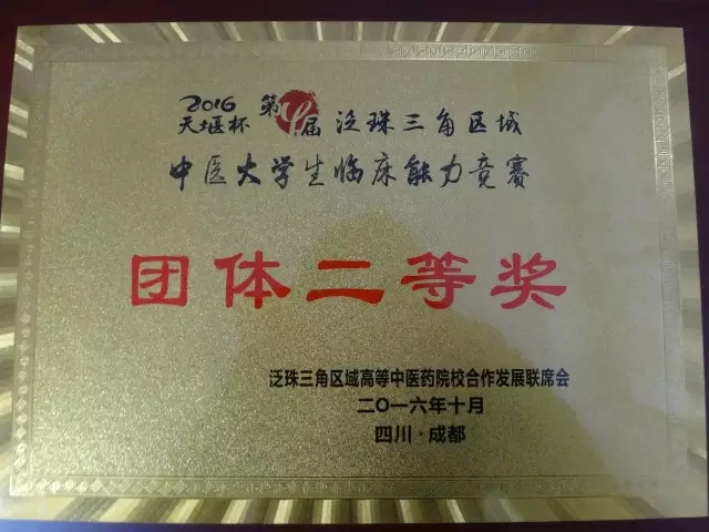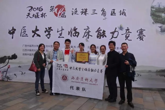 2016年10月20-22日,“天堰杯”第四届泛珠三角区域中医大学生临床能力竞赛在成都举行,我院副院长刘建等带领吴玥、徐川岚、贾兵和黄小清四名学子参加了比赛。经过激烈角逐,中西医结合学院代表队荣获团体二等奖,吴玥荣获舌诊与脉诊技能竞赛单项二等奖、中药知识竞赛单项三等奖,黄小清荣获中医外科技能竞赛单项三等奖。 比赛现场 颁奖现场 西南医科大学中西医结合学院代表队 据悉,此次竞赛由教育部高等学校中医学教学指导委员会主办,成都中医药大学承办,来自泛珠三角区域包括港澳地区的14个中医药院校的55名选手参加了竞赛。