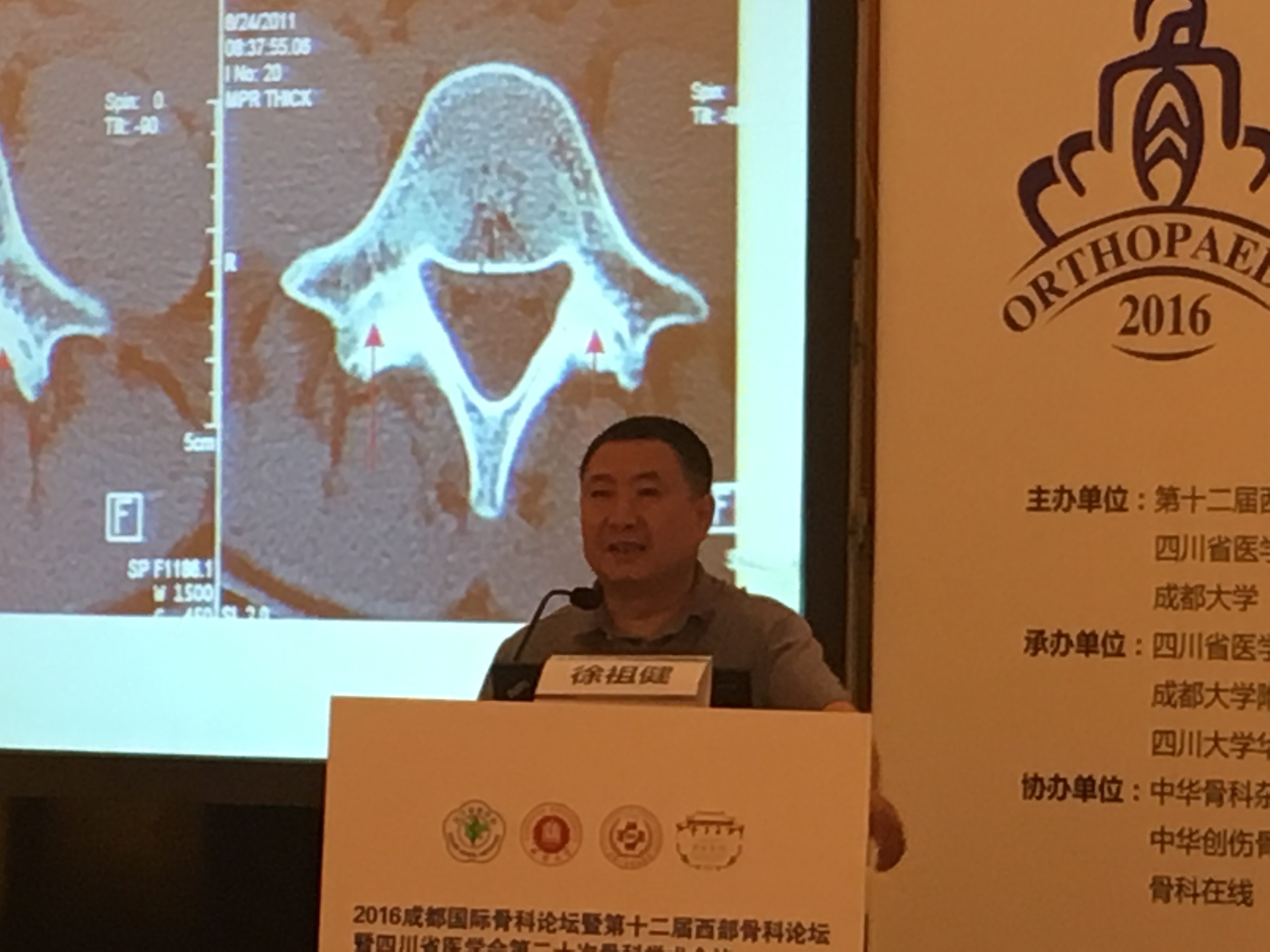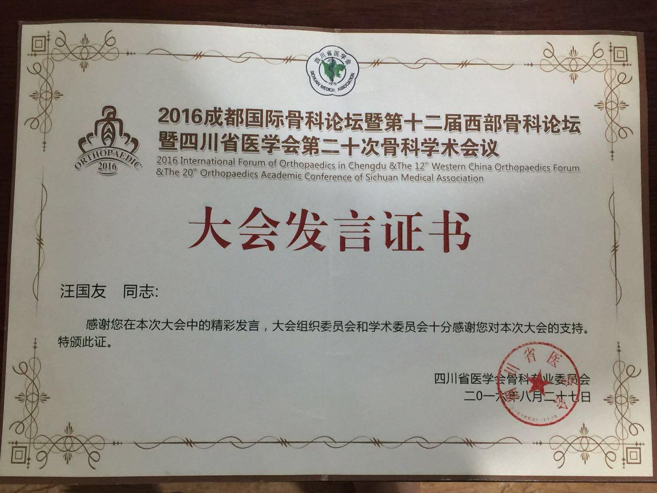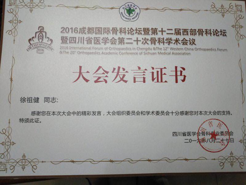 近日,2016成都国际骨科论坛暨第十二届西部骨科论坛暨四川省医学会第二十次骨科学术会议召开,我院骨伤科(关节·足踝组)徐祖健教授、副主任汪国友副教授分别作了《青少年腰椎弓狭部裂微创免疫治疗探讨》《全关节镜下治疗踝关节不稳》专题讲座。